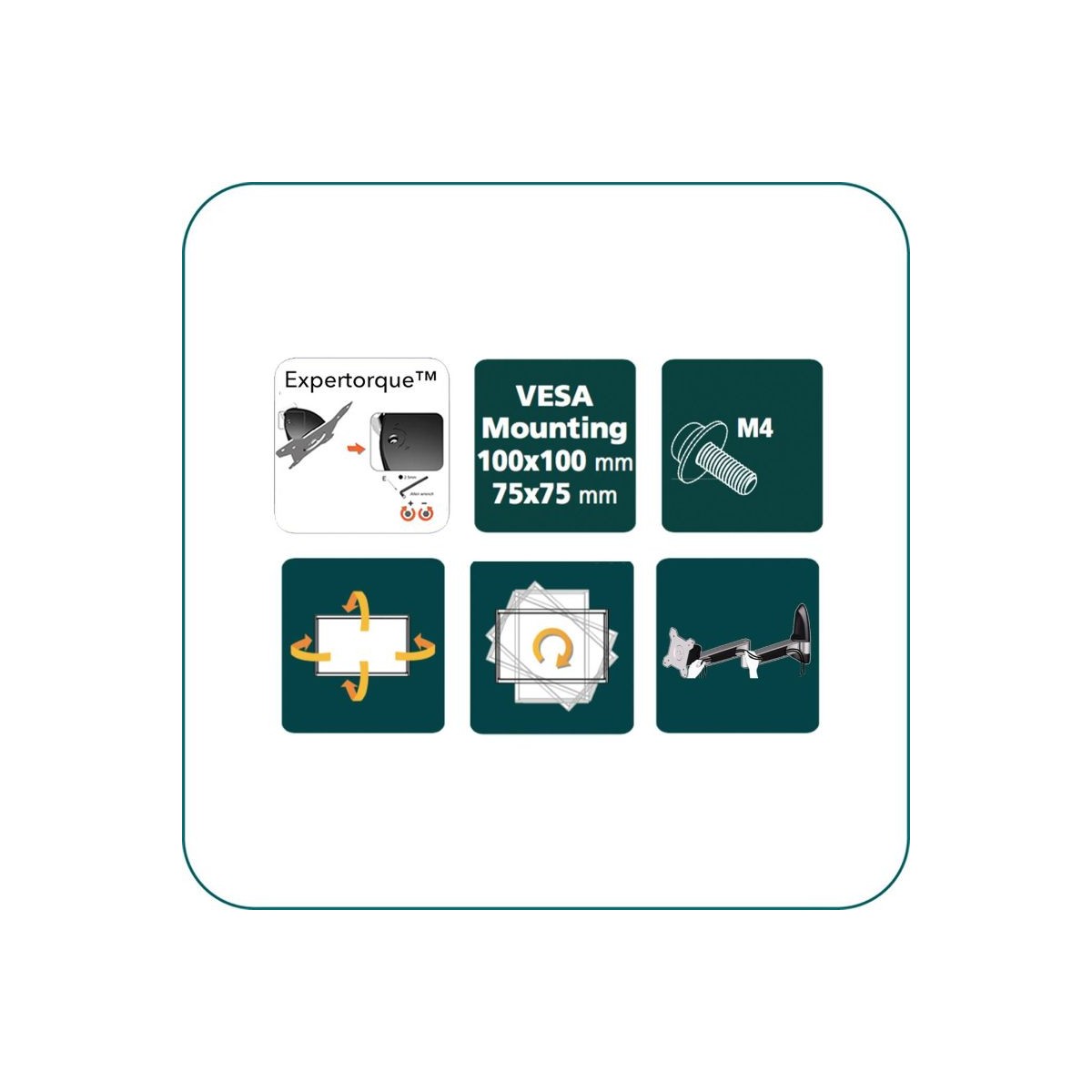 With the Arm Tilt angle of +/-15°, swivel +/- 90° and rotation 360°, it gives you the best viewing angles for screens. It supports max. mounting 100x100/75x75mm display and ExperTorque™ technology enables adjustment of the screens hinged by its weight.