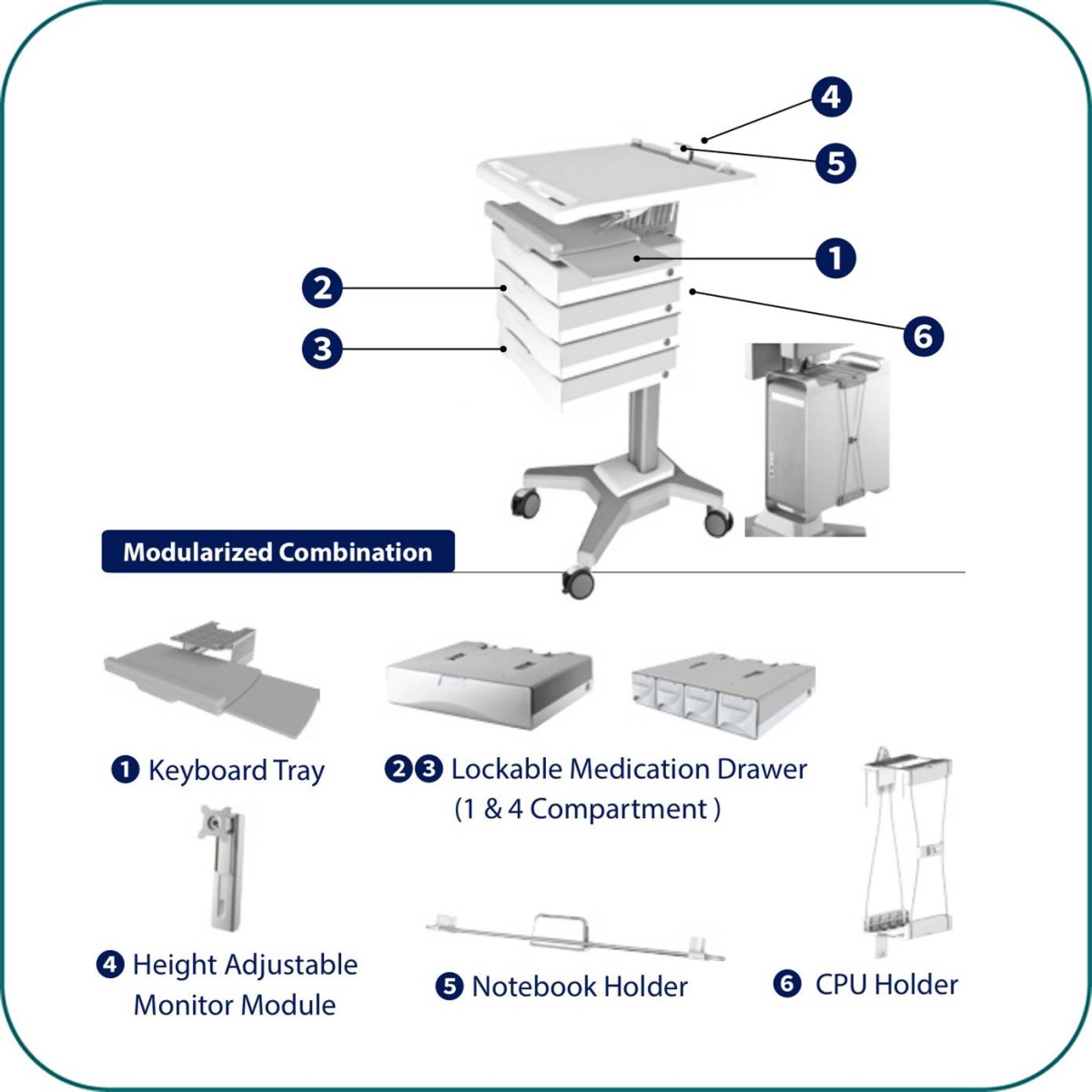 Product code:Aavara CDS200 is Simplified Mobile Computer Cart cart, featuring modularized combination with optional accessory based on what you exactly like to install. It comes in CPU Holder/ Notebook Holder/ Keyboard Tray/ Lockable Medication Drawer and Height adjustable Monitor stand module. It designed with a manual lift to adjust the heights and working surface.