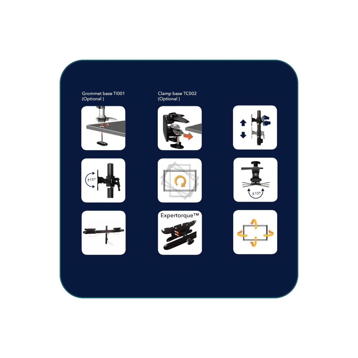 Product code:Aavara new design DI210 is a Dual LED/LCD Monitor Grommet base stand, featuring a wide angle of +/- 15 degree Tilt, swivel and a 360 degree rotation. It supports VESA 200x100/100x100mm display and ExperTorque™ technology enables adjustment of the screens hinged by its weight.