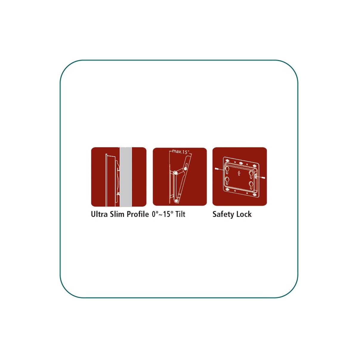 It supports 22~52 inch displays with VESA mounting pattern 200x200mm. Tilt 0°~15° free angle and comes with safety lock to secure displays in place at home or outdoors. Distance to wall 1.77 inch to fit the stylish home decor.