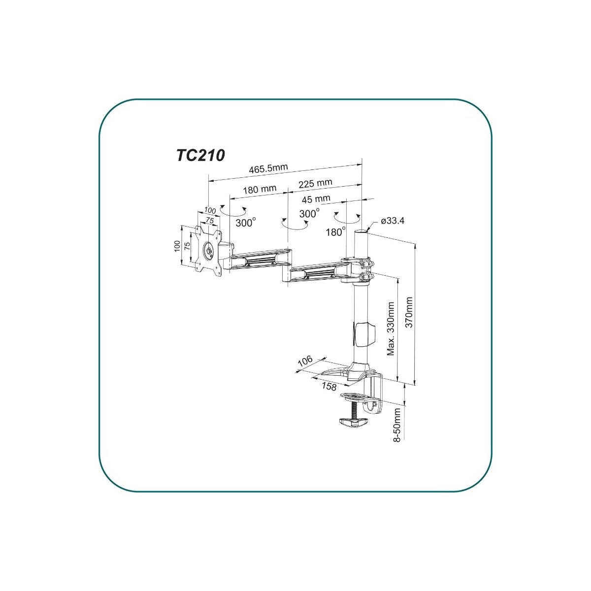 Product code:Aavara TC210 is a Single LED/LCD Monitor clamp base stand, featuring a wide angle of +/- 20 degree Tilt, +/- 20 degree swivel and a 360 degree rotation. It supports VESA 100x100/75x75mm display and ExperTorque™ technology enables adjustment of the screens hinged by its weight. Pole Height adjustment up to 355 mm /13.19''