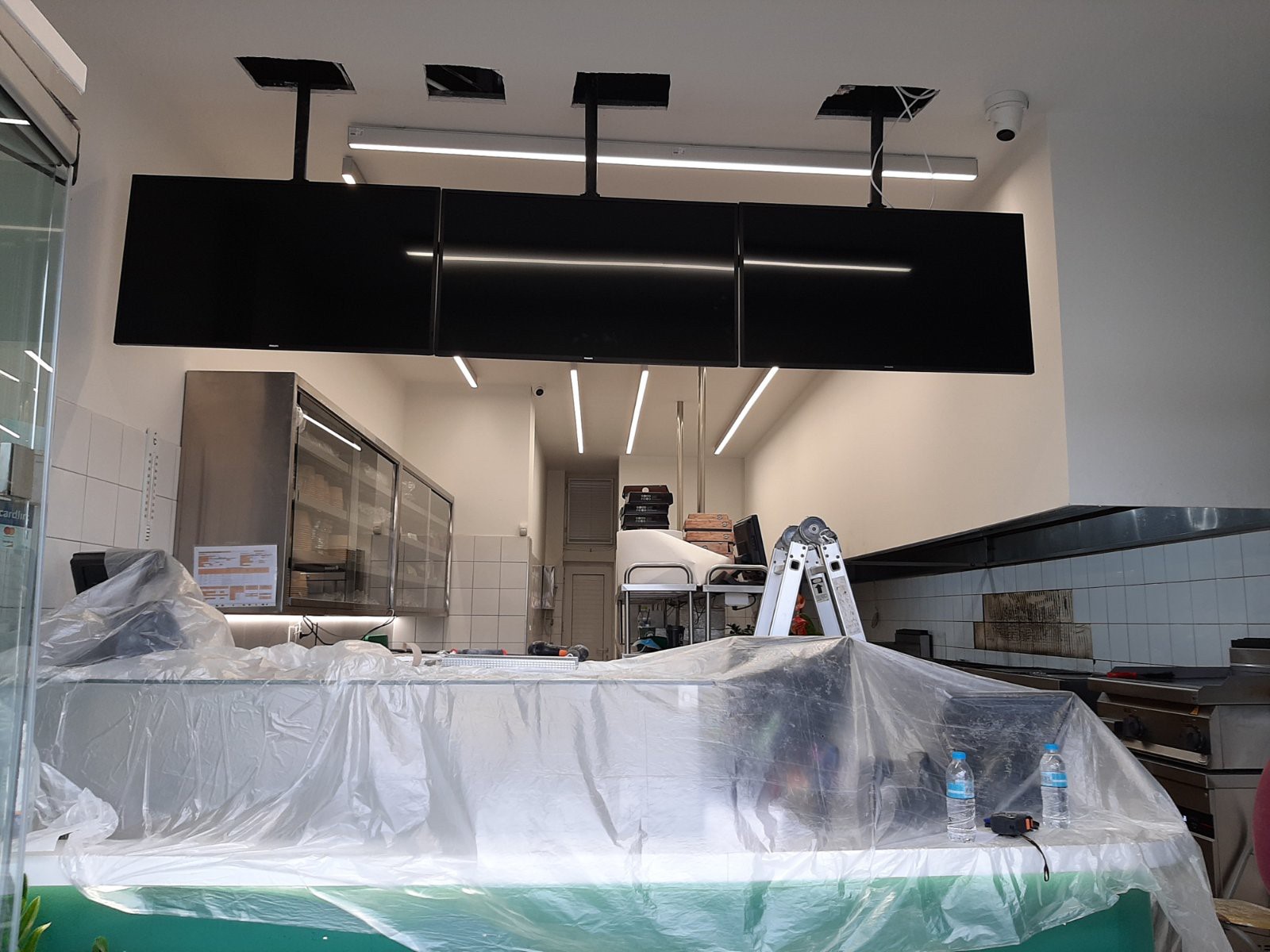 We created a dynamic digital display, using 3 pieces Philips 43BDL3510Q/00 Professianl Signage Display & 3 pieces of Multibrackets 7350022735460 M Public Ceiling Mount Medium Single 3000.