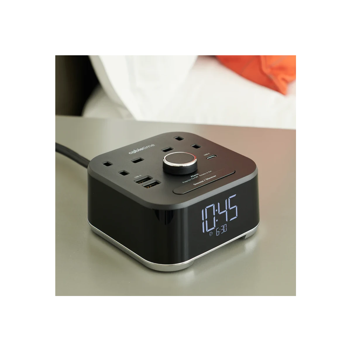 CubieTime is perfect for a hotel guestroom with its minimal footprint, easy to set alarm, display dimmer, and guest facing power (230v UK Socket), 2 USB-A and 1 USB-C Ports.