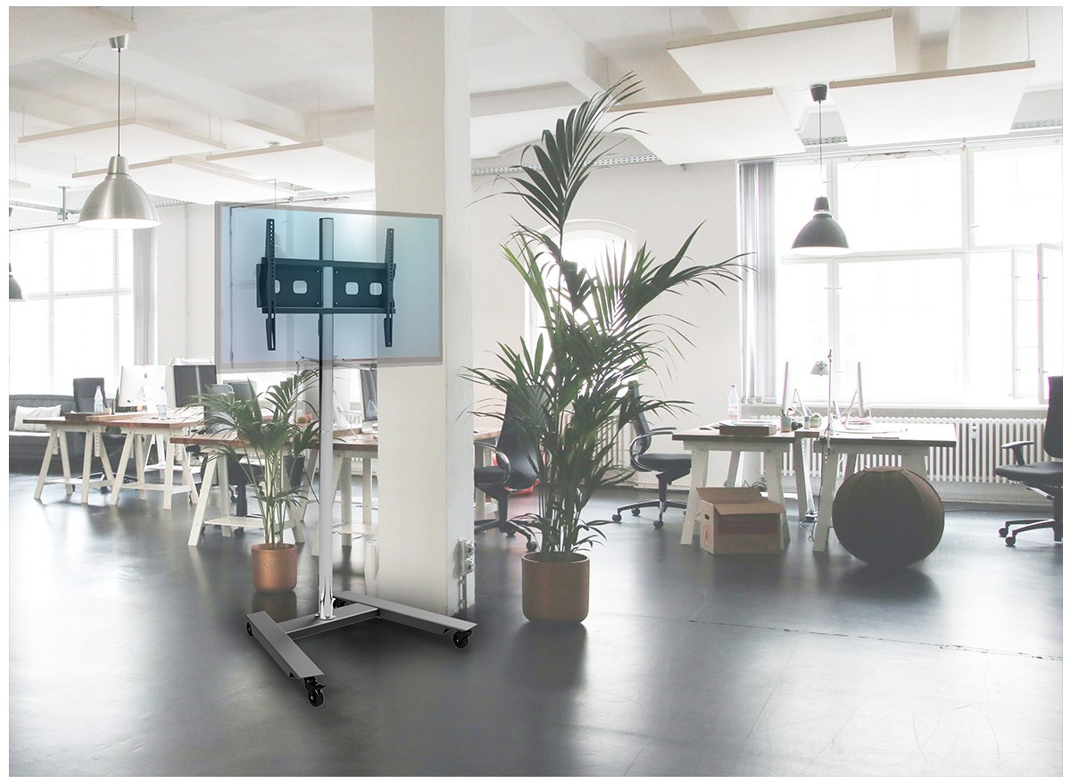 Product code:TR5E is a universal videoconferencing trolley. The lightweight and minimalist design of powder-coated steel and polished tubing makes it perfect for any interior such as offices, conference rooms and waiting rooms. Adjustable height makes the TR5E extremely functional. TR5E has a cable organization system to hide cables and maintain an aesthetically pleasing installation. Castors with a braking mechanism ensure mobility.