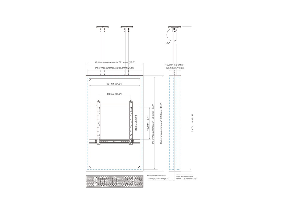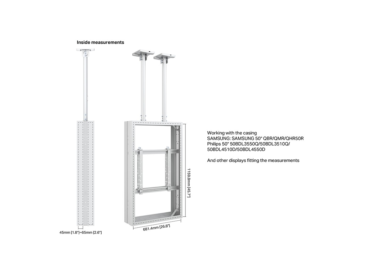 This Universal 50" Casing/ Enclosure was designed to blend in perfectly in most environments. Added its ingenious design makes many smart options available right away or after time, mounting solutions with wire function, floor to ceiling or floor stand and ceiling mounting is available.