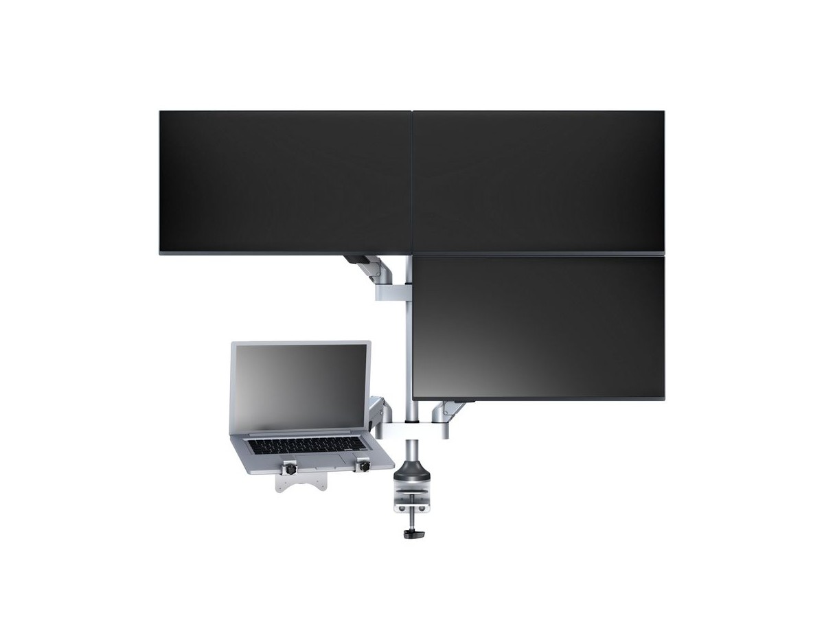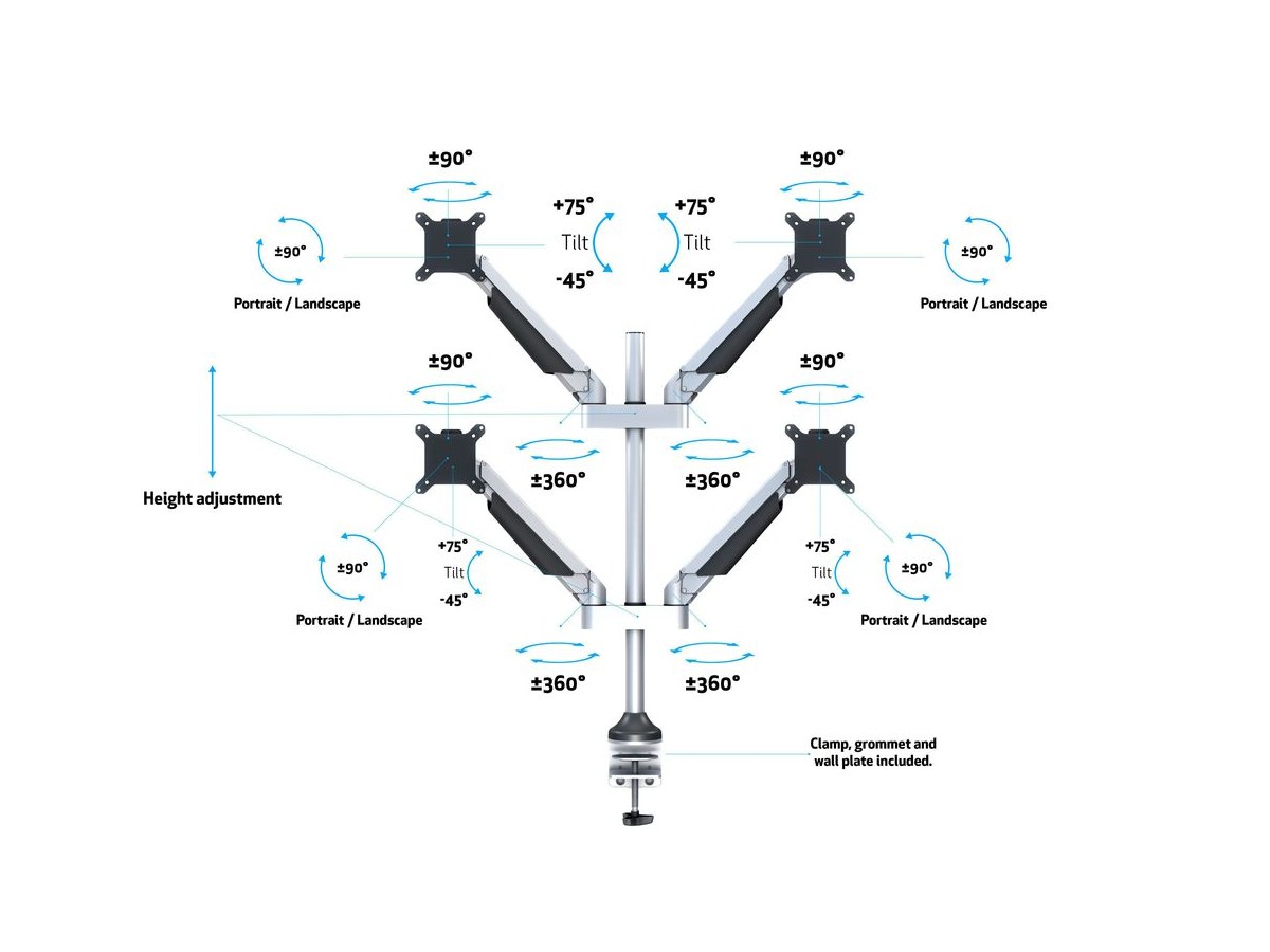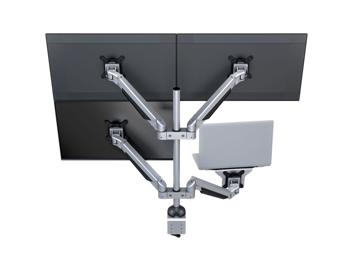 The Quad triple jointed gas suspended monitorarm was designed by Multibrackets to optimize your productivity and help reducing strain on neck, back and eyes.