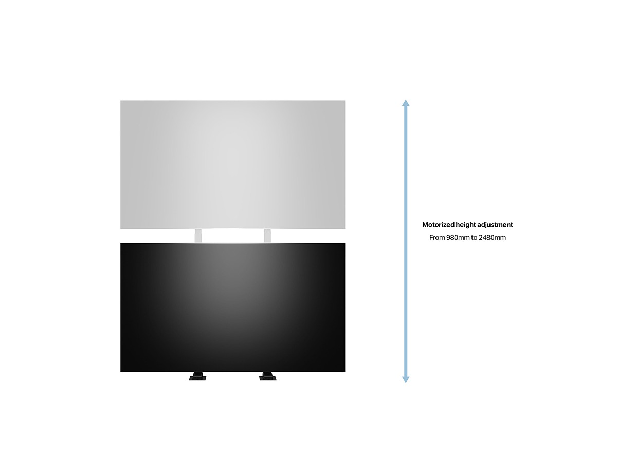 The M Motorized TV Lift Duo X-Large accommodates TVs up to 100", whether at the foot of your bed, in a living room cabinet, or in an office meeting room. With a simple push of a button, raise the TV to a perfect viewing height. With a weight capacity of 100kg, it can support nearly all TVs up to 100" on the market, whether new or old. The lift offers a maximum height of 2480mm and a minimum height of 980mm.