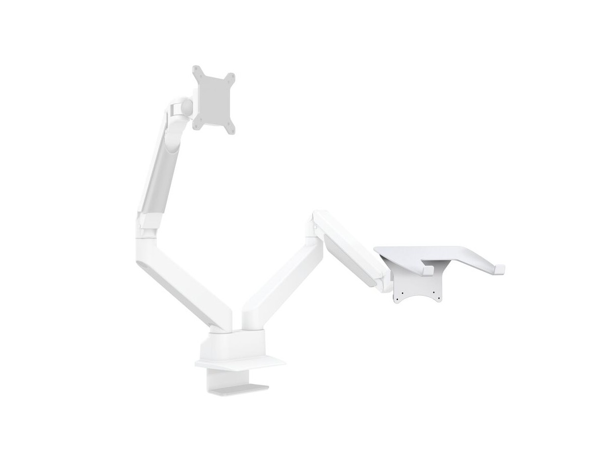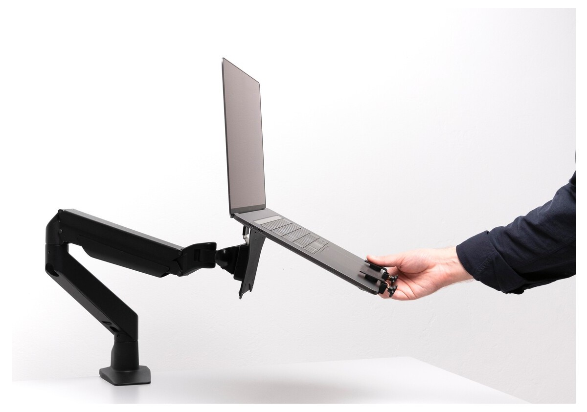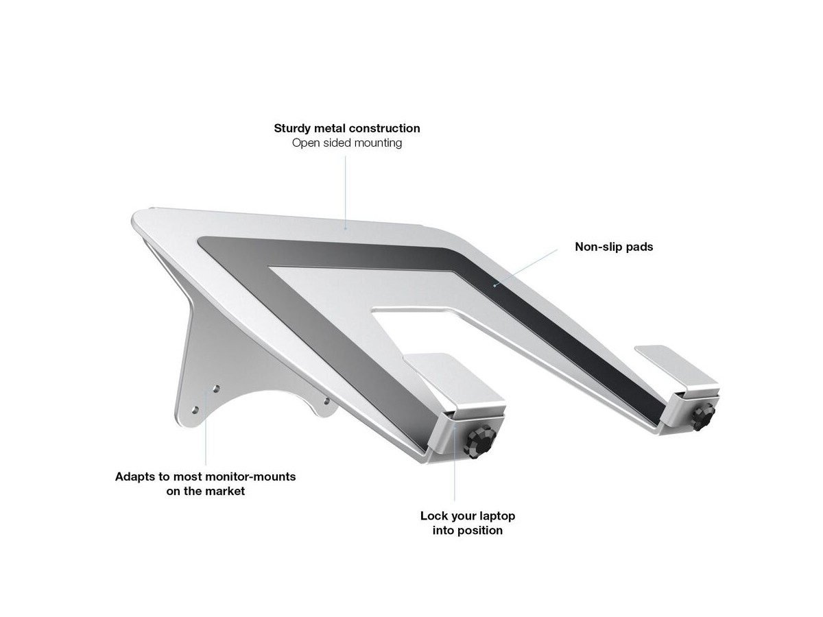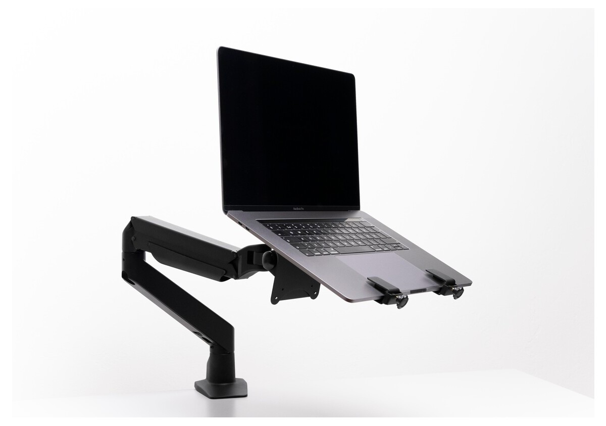 This unique holder consists of a VESA based centerpiece and its connected holding arms that gently grab your laptop. The M Laptop Holder Gas Lift Arm is VESA compatible, so it can be mounted onto almost any VESA specified wallmount, arm or desktopmount. However this laptop holder is designed to work with M VESA Gas Lift Arm.