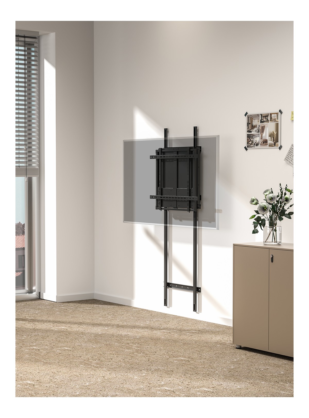 The M Counterbalanced Floormount is a robust, stationary solution for interactive display panels, designed to hold lighter displays firmly and steadily in place along the wall. With a vertical movement range of 400 mm, it is perfect for environments where displays need to be adjusted to various heights for optimal accessibility. The durable design guarantees that your display remains securely positioned, offering a stable viewing experience.