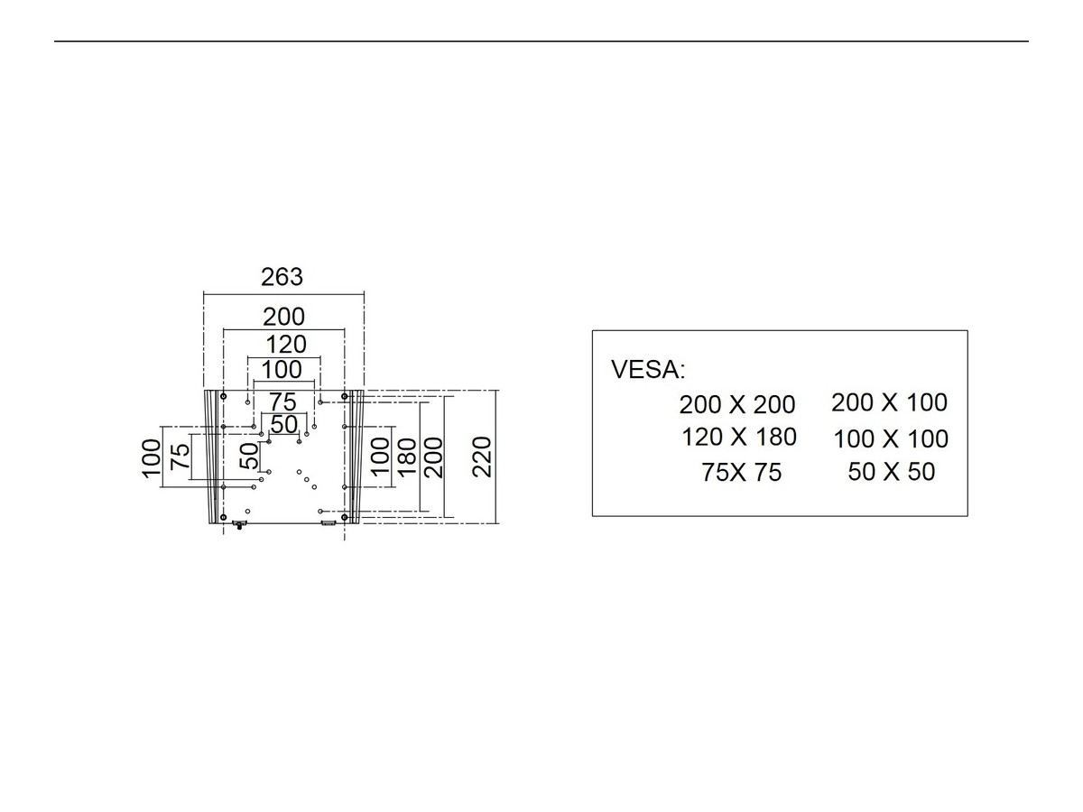 | VESA standard: | 50x50 75x75 100x100 200x100 200x200 300x200 300x300 400x200 400x400 600x400 700x400 mm |