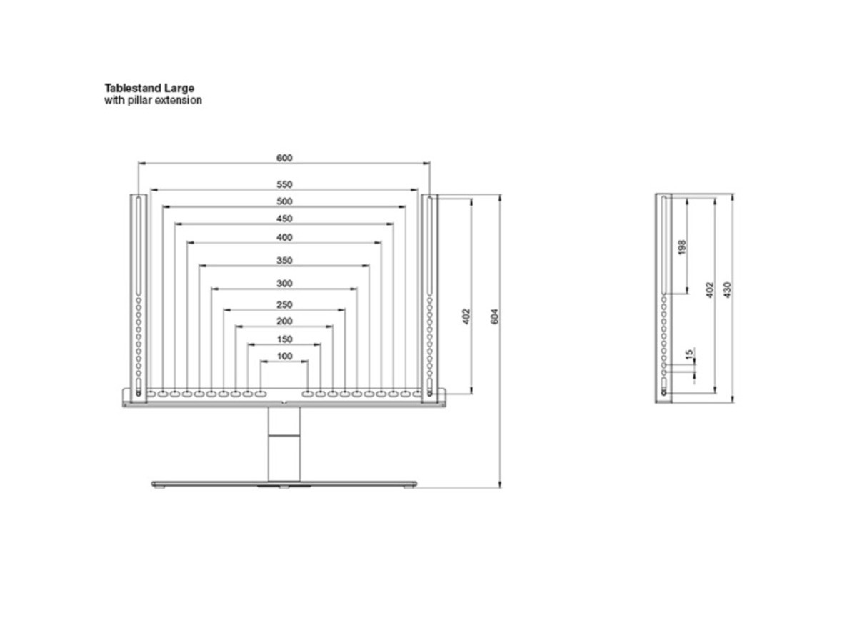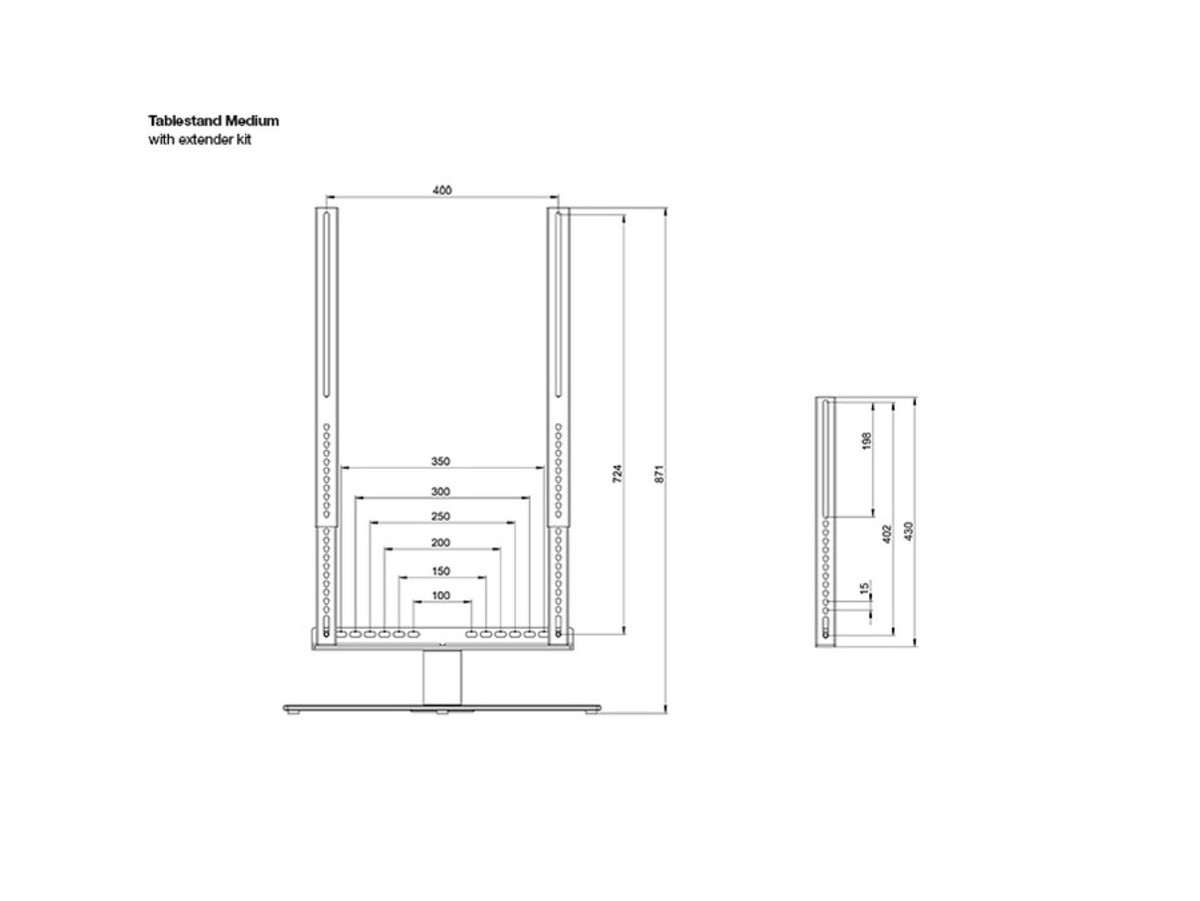 The M VESA Extender kit Turn & Motorized Tablestand works with both the basic Tablestand Turn and the Motorized version from Multibrackets. The Extender kit is assisting users who have a large screen size for their table stand, or if the VESA holes are placed high up on the screen backside. Both situations where the screen would need to be moved to a higher position.