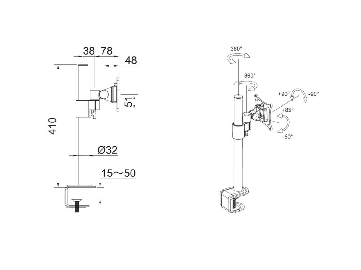 | Installation: | Desk clamp, adjustable 10 - 50mm |
