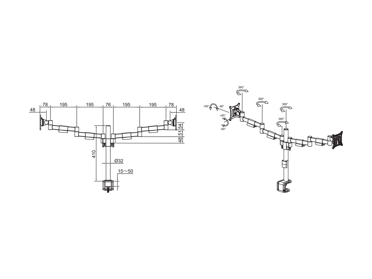 | Installation: | Desk clamp, adjustable 10 - 50mm |