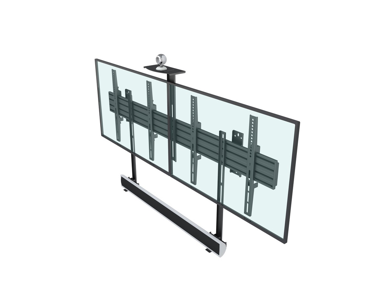 Create a meetingroom solution. Poly, Logitech and Yealink are a few of the popular meetingroom brands for cameras and or videobars that can be used with ths camerashelf (always check weight and measurements). Attach the camera solution over or under the display. Using Pro Series the choice is yours.