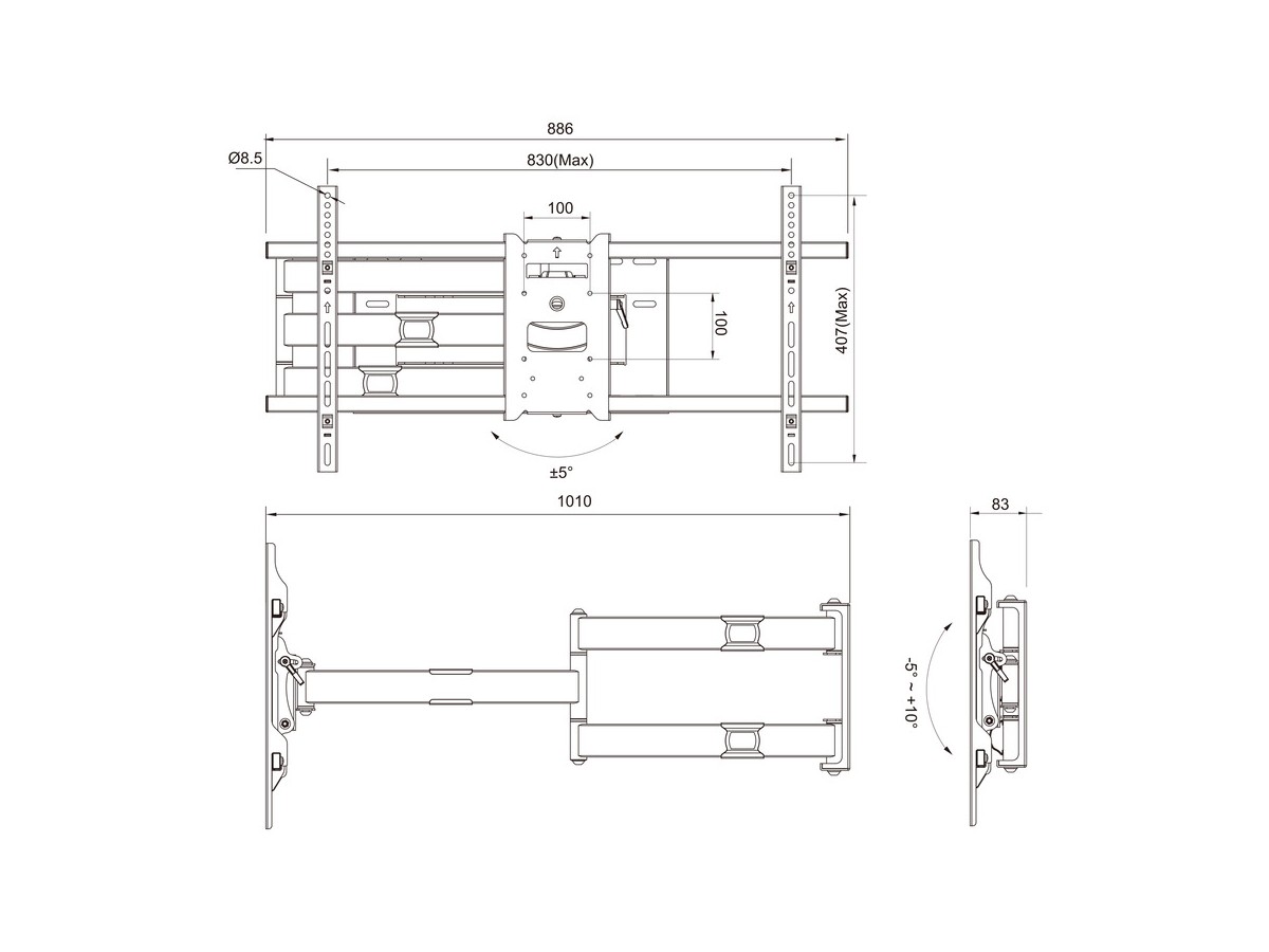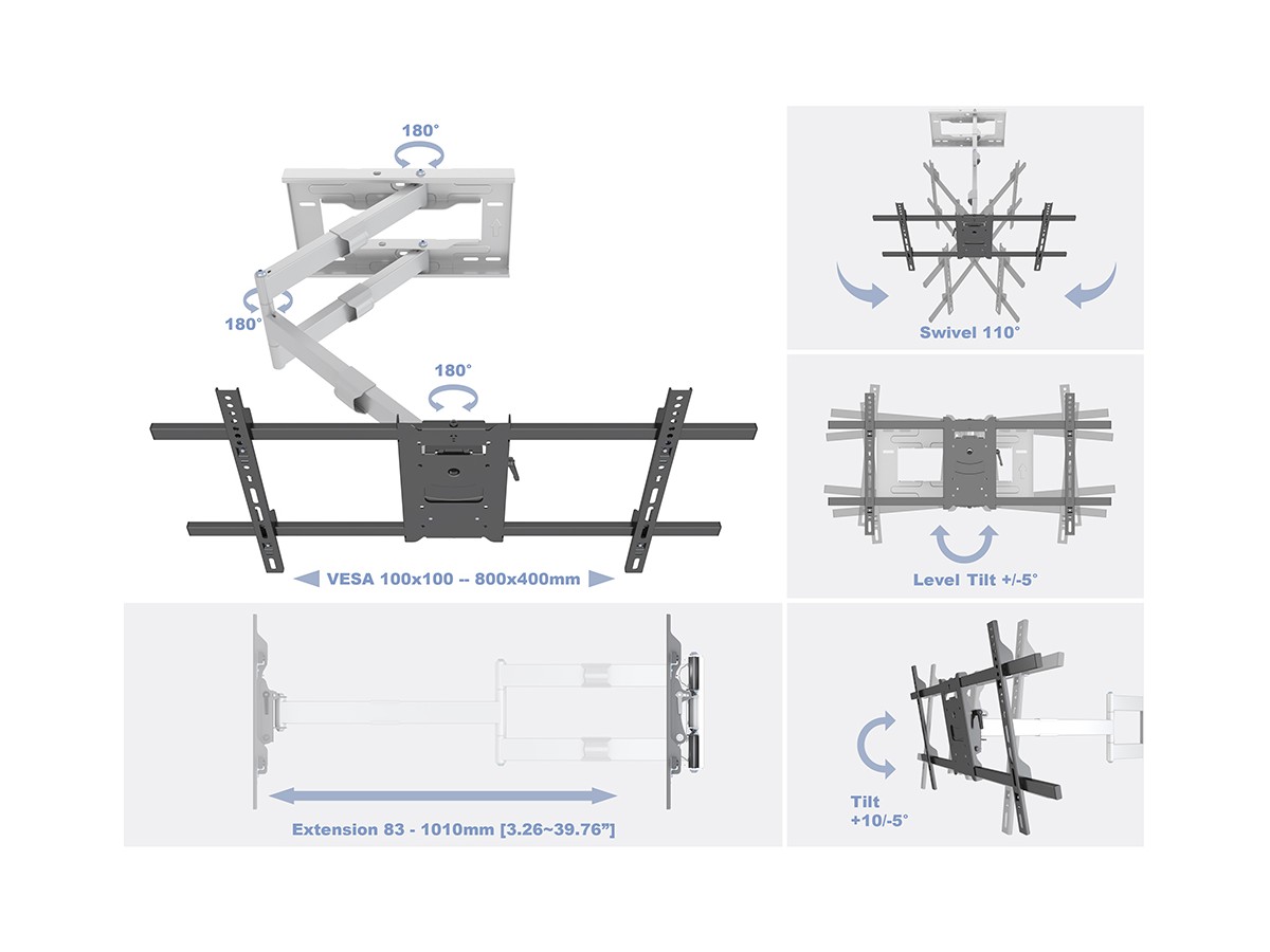 - Universal design supports VESA 100x100,200x100,100x200,200x200,300x200,300x300,400x200,400x400,600x400,800x400