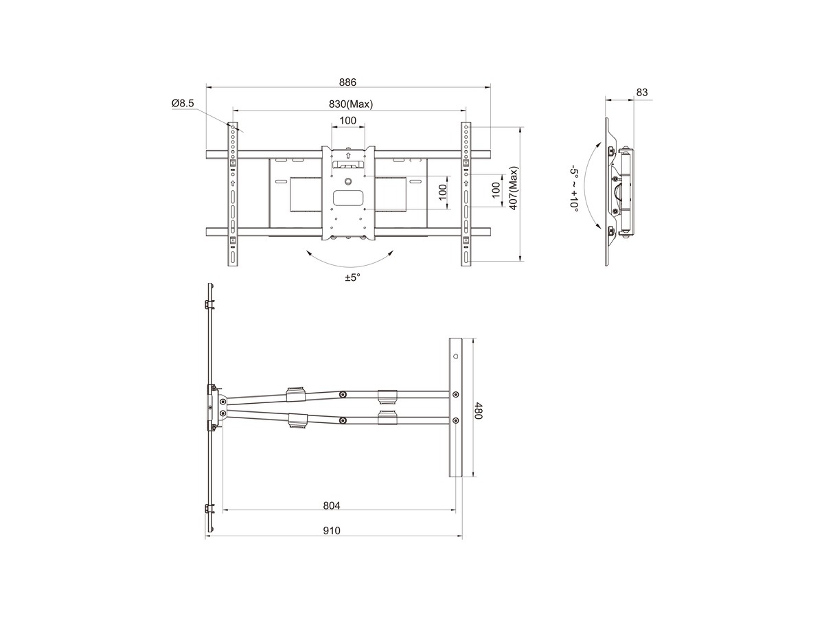 | VESA standard: | 100X100,100X200,200X100,200X200,200X300,200X400,300X200,300X300, 400X200,400X300,400X400,500X300,500X400,600X300,600X400,700X400,800X400 |