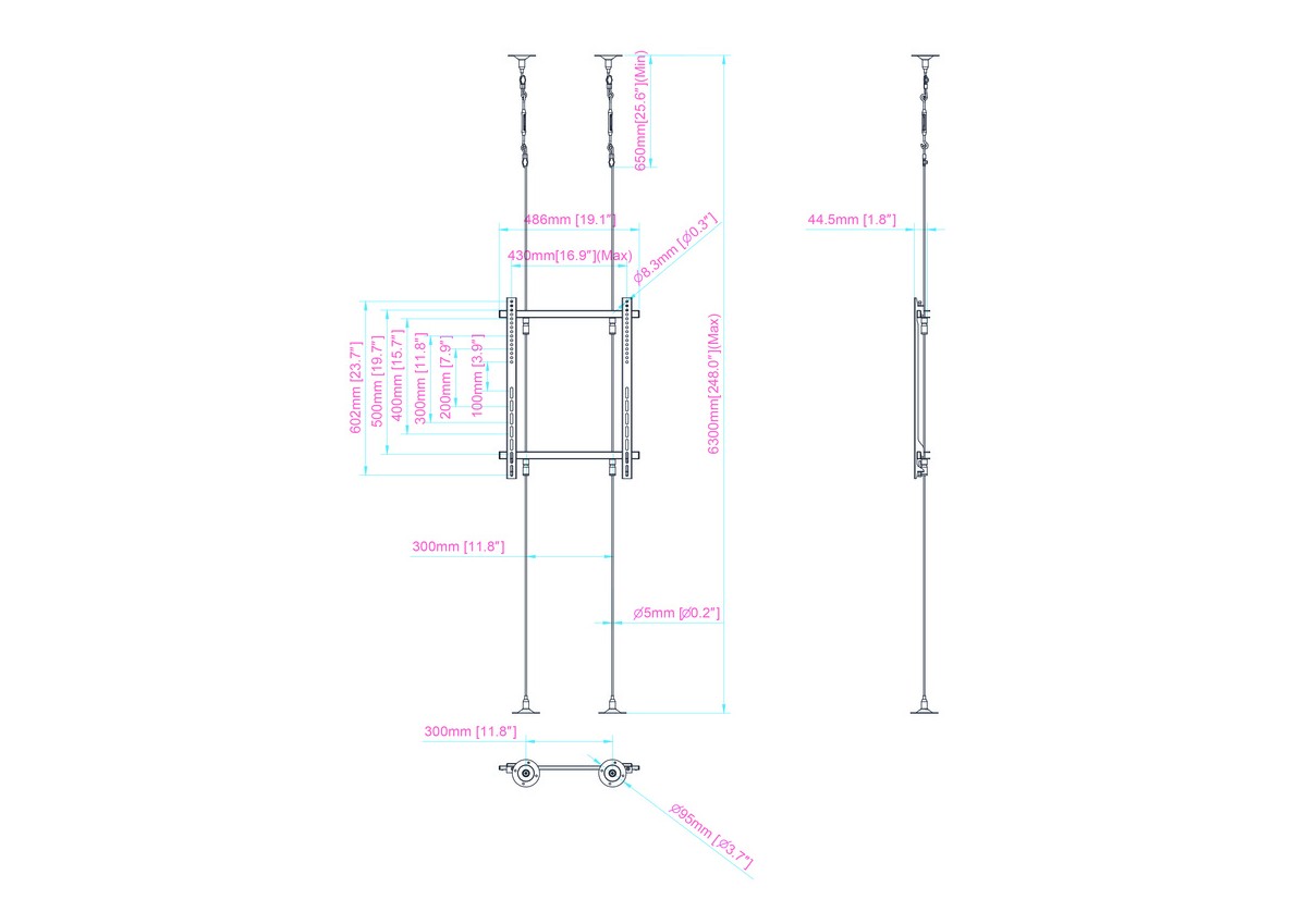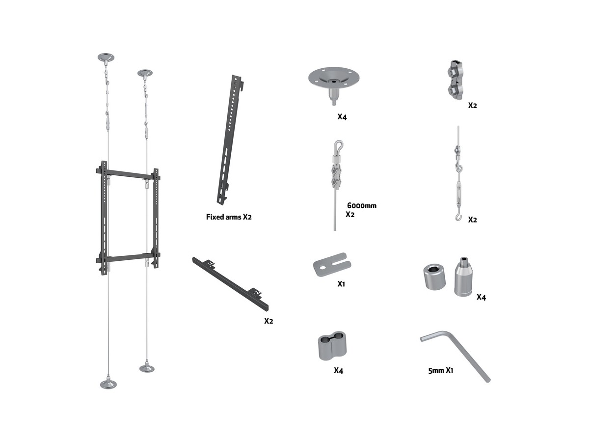 Product code:M Pro Series - Wire 6000 - Ceiling mount for LCD display, steel wire, 6m length, 1 screen, single side, fixed arms, VESA Max 400x600 - screen size: 40"-65" - max load: 30kg - black