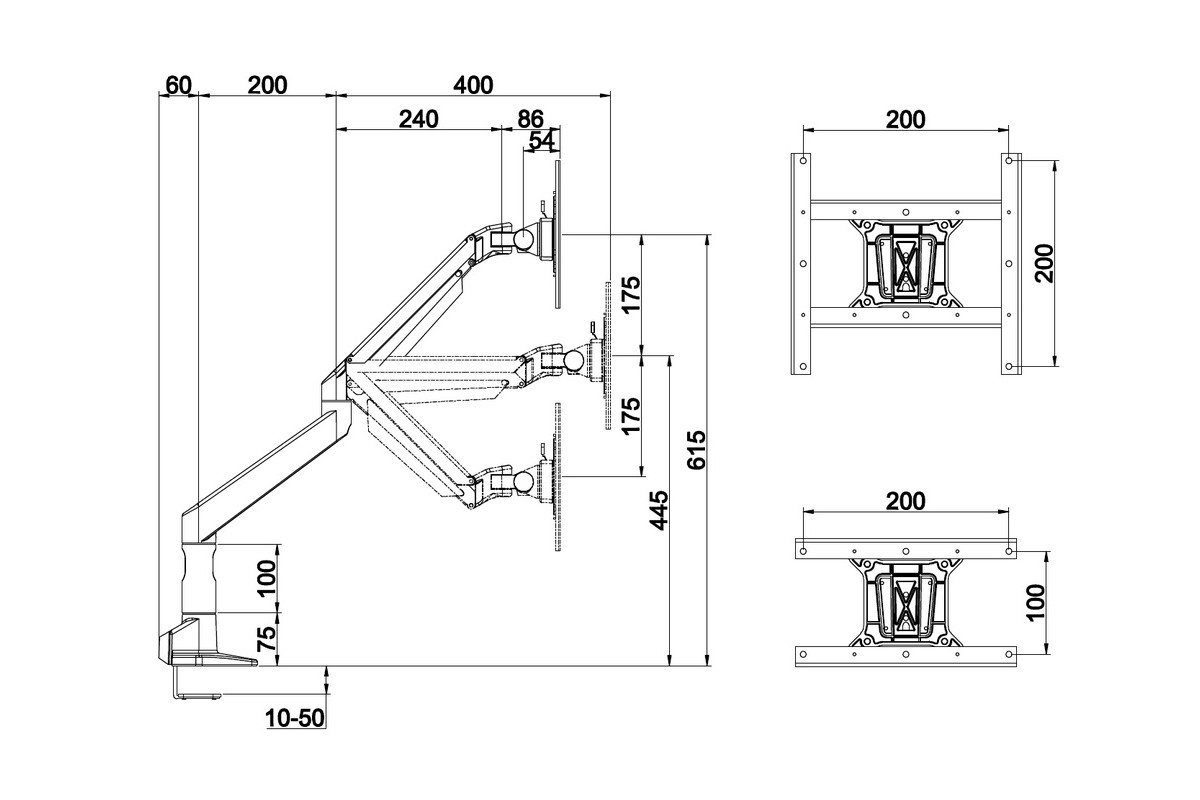 Supports VESA standards 75x75, 100x100 and 200x200 holds screens weighing from minimum 2kg and up to maximum 10kg. This interval is important to keep due to the gas driven piston that keeps your screen floating in the air.