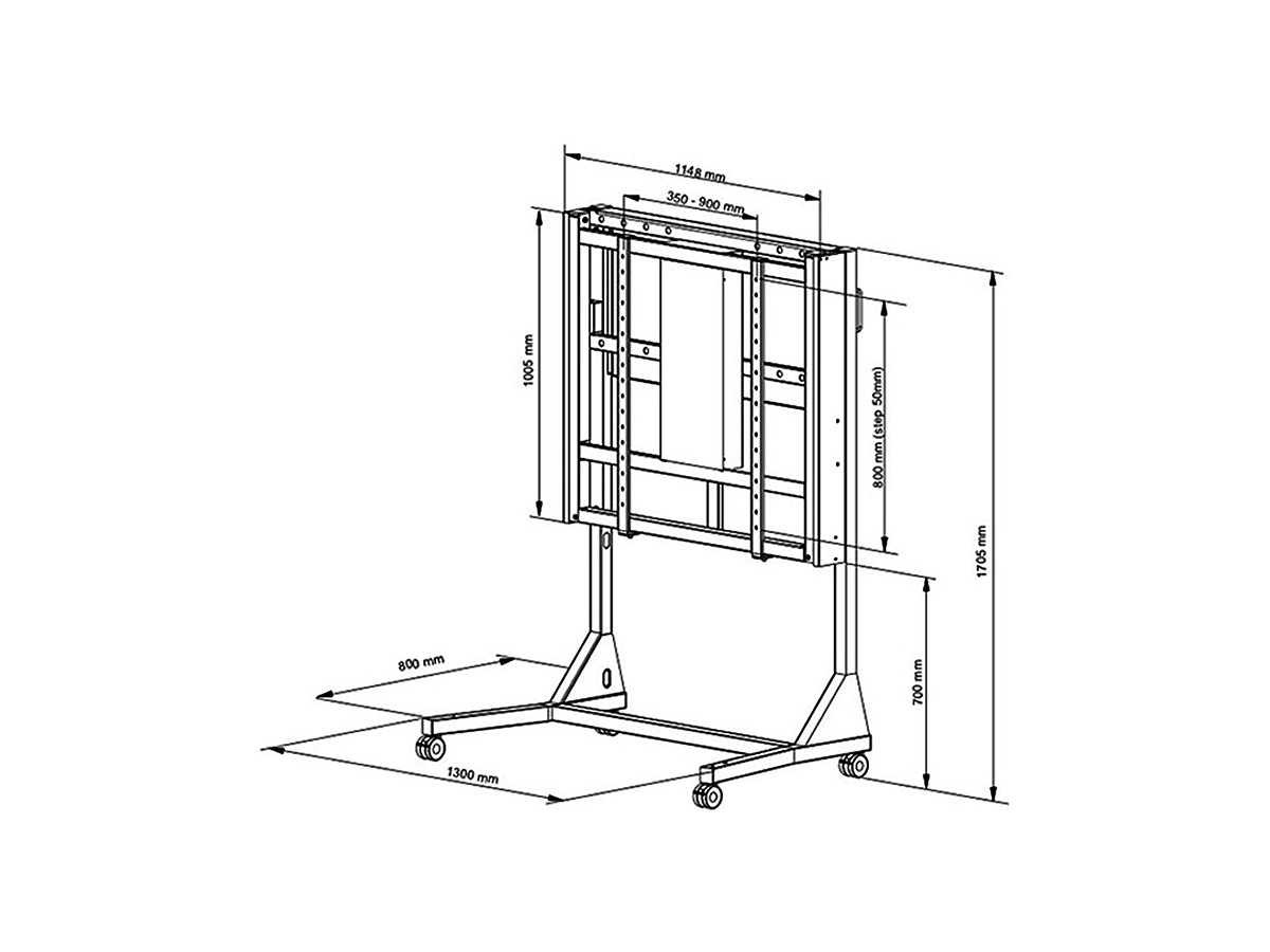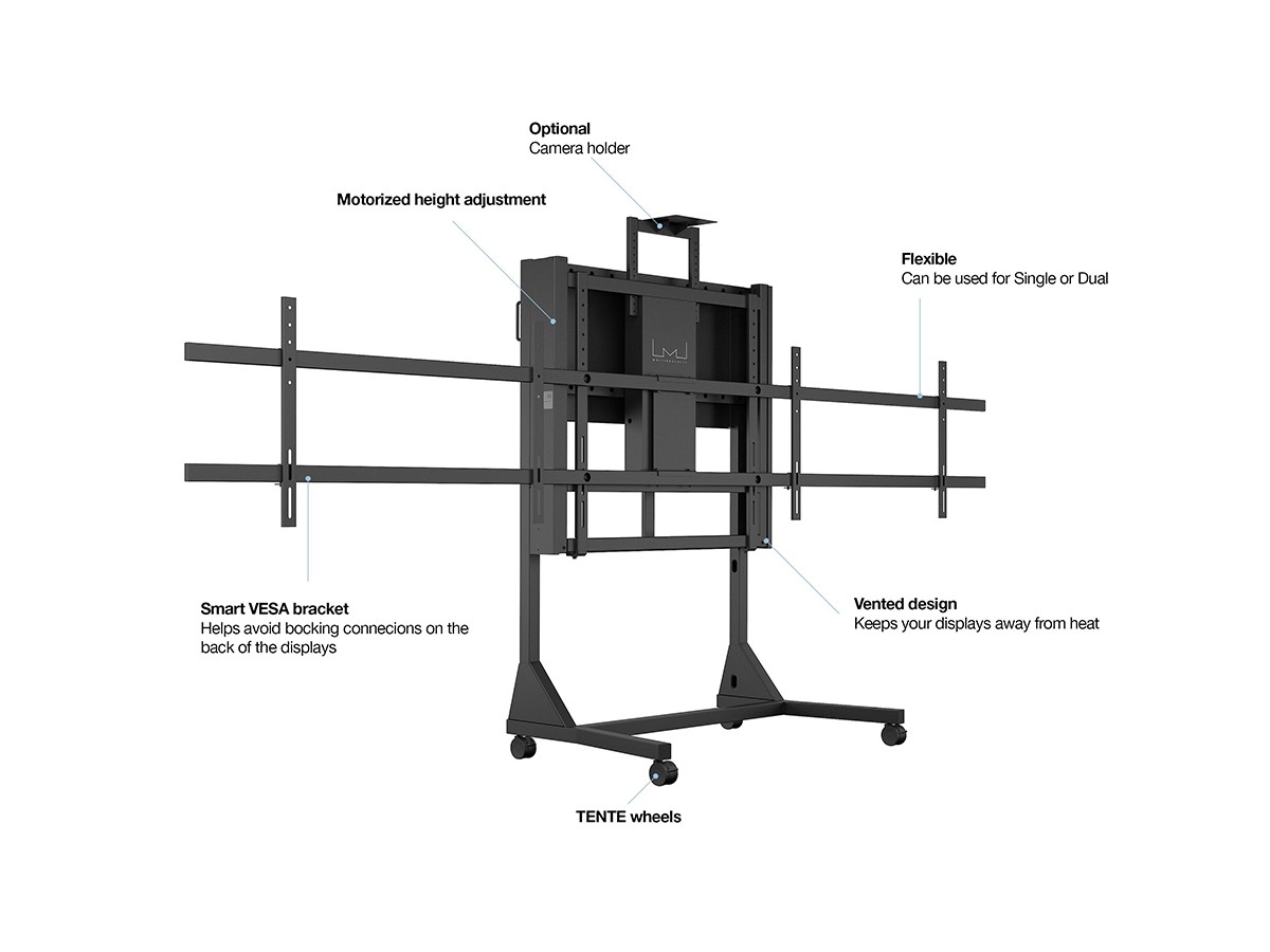 A variety of accessories (optional) available it makes it ideal for use anywhere where a screen needs to be height adjustable or where there is a crowd that might e sitting and/ or standing. For the Dual Screen solution the camera shelf is a sought after accessories. Easy to mount and very stable It can hold even heavier videoconference cameras.
