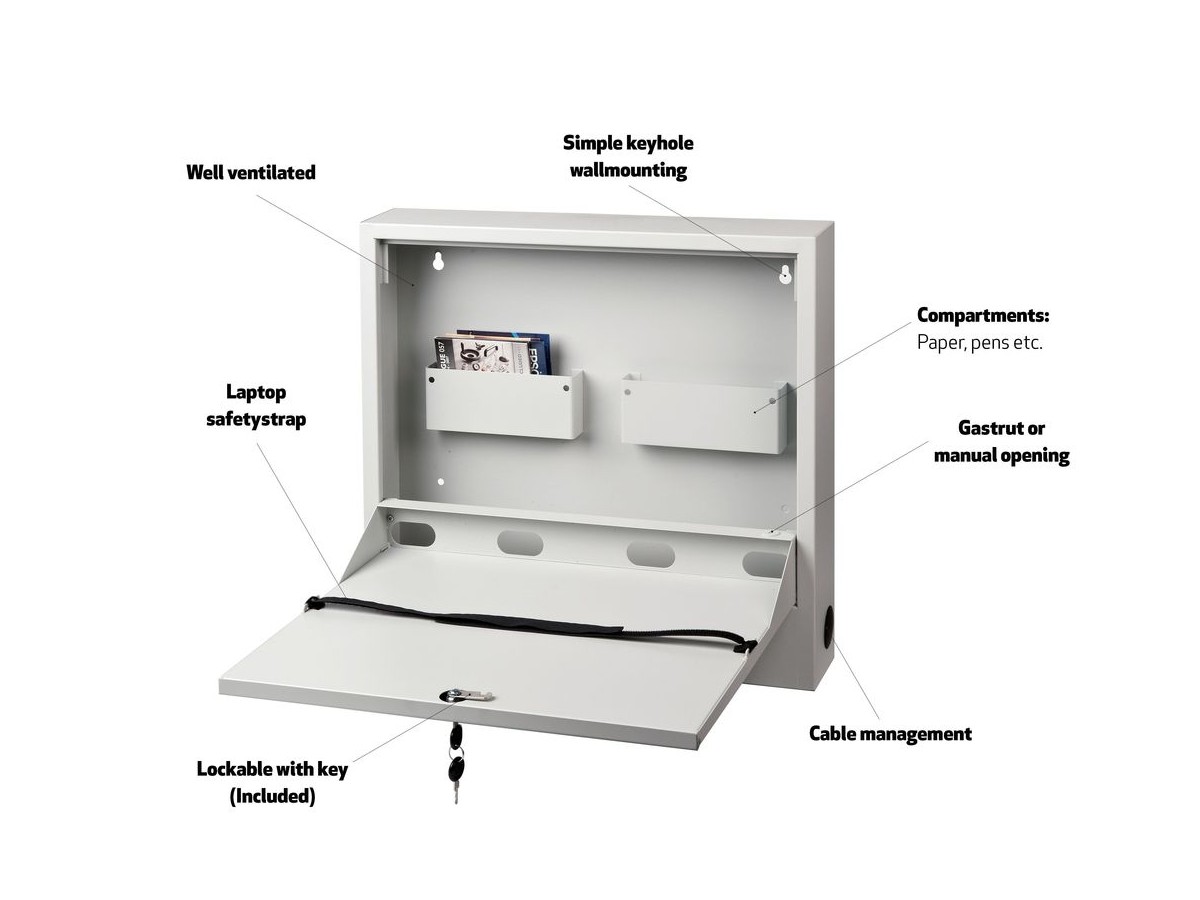 A wallmounted safety cabinet. Practial, lockable and produced with robust steel. Protects your Laptop during unguarded moments. Compatible with most existing laptop and docking stations on the market.This product was initially intended for storage of laptops in classrooms, it still does but many more has seen the need to secure their data locally. It is designed in a way that enables mounting on the wall and simplifies your cable management.