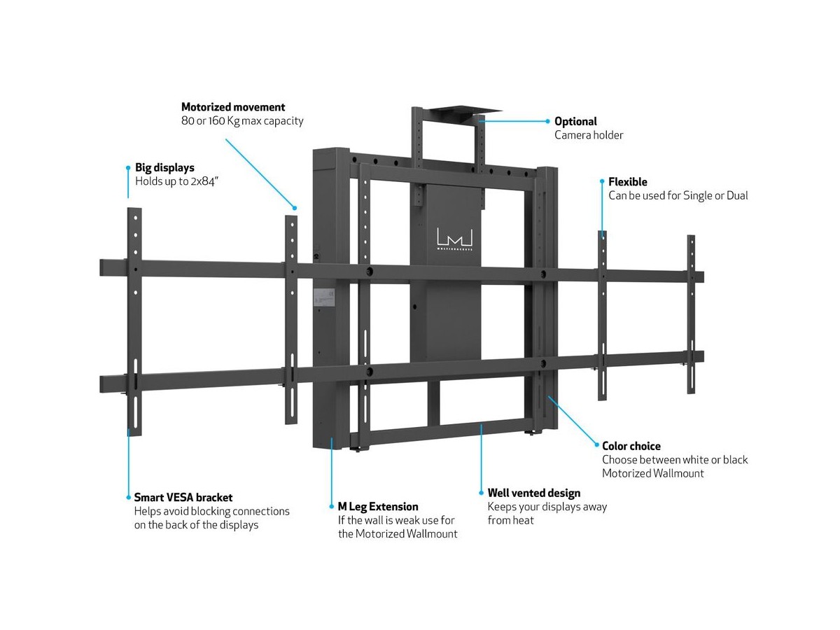 Product code:M Motorized Wallmount Dual Screen 160 kg Black SD - Stand kit (motorized wallmount) for dual displays - up to 84" - black