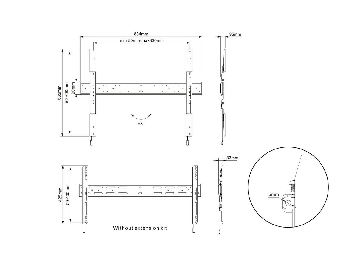 - Vertical rails slide on wall plate for minor left/right lateral shift after installation