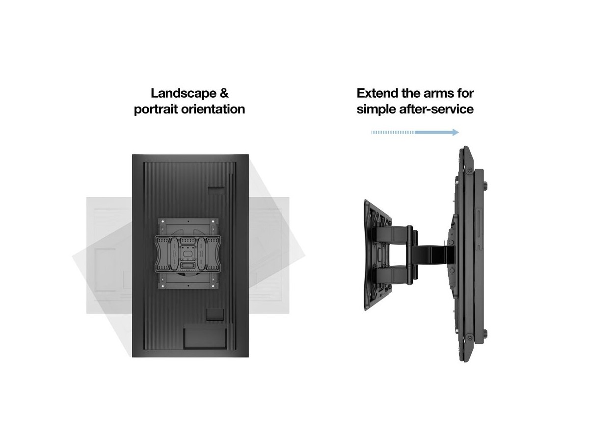 M VESA Super Slim Tilt & Turn HD is suitable for a wide range of screens sized 40" and up to 85". The VESA standards that are supported by this mount is 100 / 200 / 300 and up to 400 mm. If needed, the wall mount can be combined with an optional VESA extender kit which enables the 600x400 mm VESA standard. This means that M VESA Super Slim Tilt & Turn HD is suitable for most of the VESA standards including the rare ones.