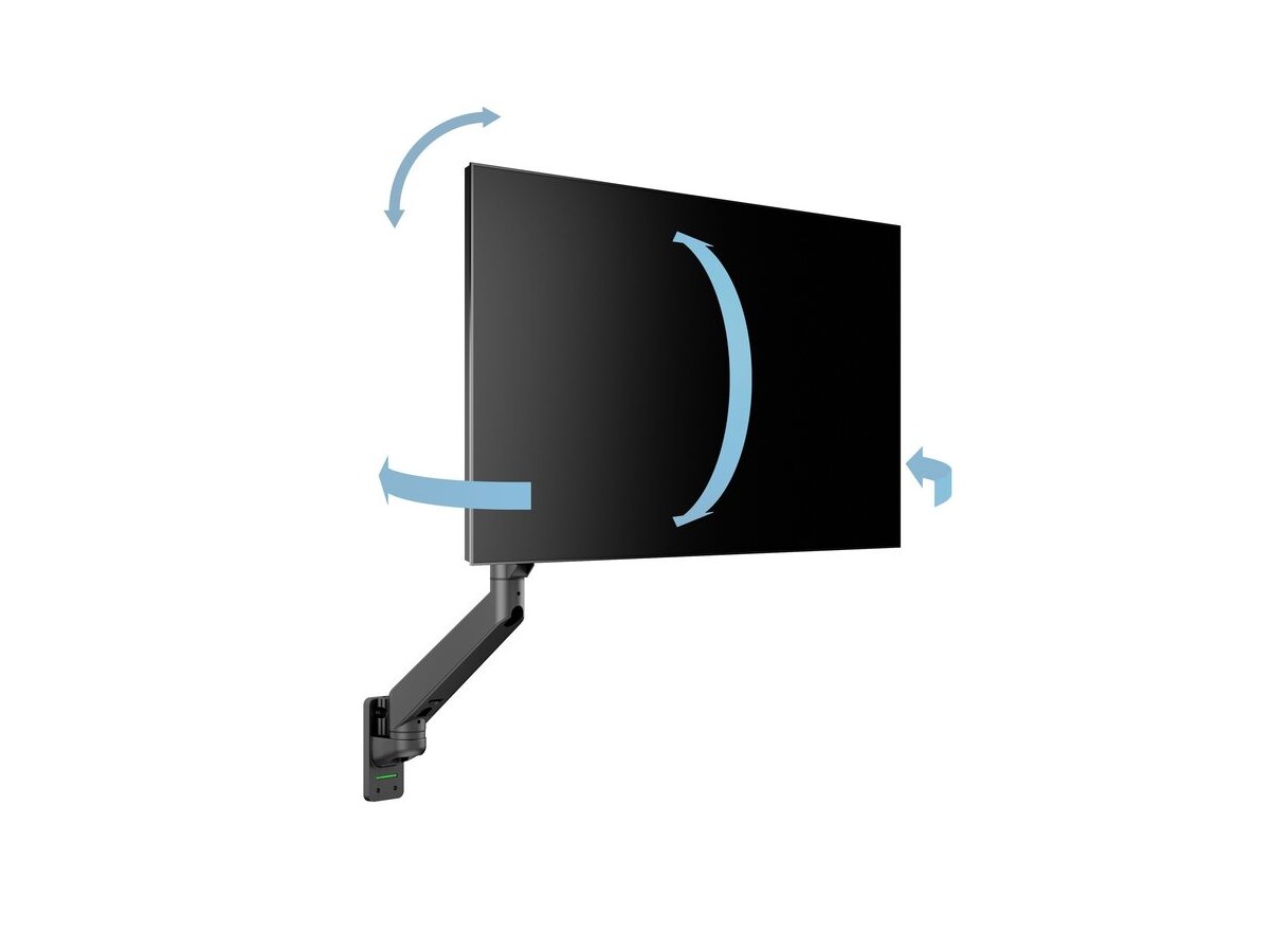 Our M VESA Gas Lift Arm Single Wall is made out of a durable aluminum construction and uses a gas driven suspension technique. This makes the screen "float" and it can then be moved with near zero effort. Sleek and streamlined, the M VESA Gas Lift Arm Single Wall frees up space and allows positioning of your display for greater productivity. The unique counterbalance gas technology provides smooth adjustment in any direction. Easy move the screen from landscape to portrait position or move the screen close to the desk, high up, matching almost any wanted working position imaginable.