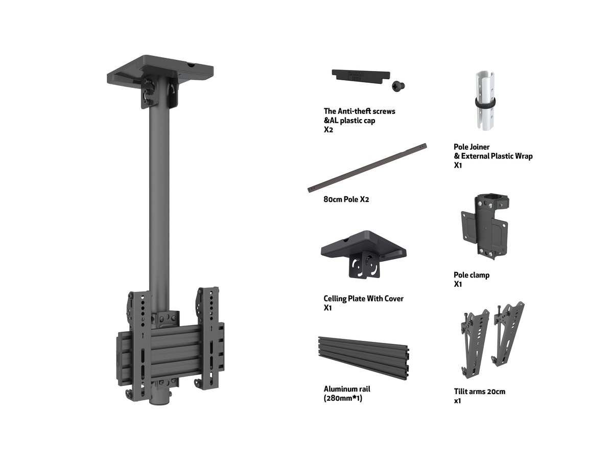 | Pillar length: | Min: 580mm to Max: 1550 mm from ceiling to VESA plate center Extension pipes: 1.5m (800mm*2pcs) included |