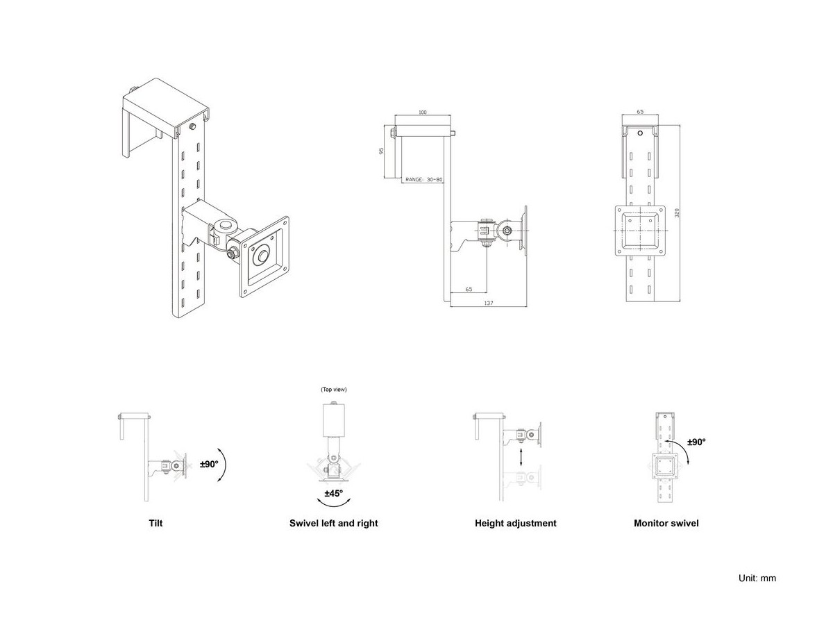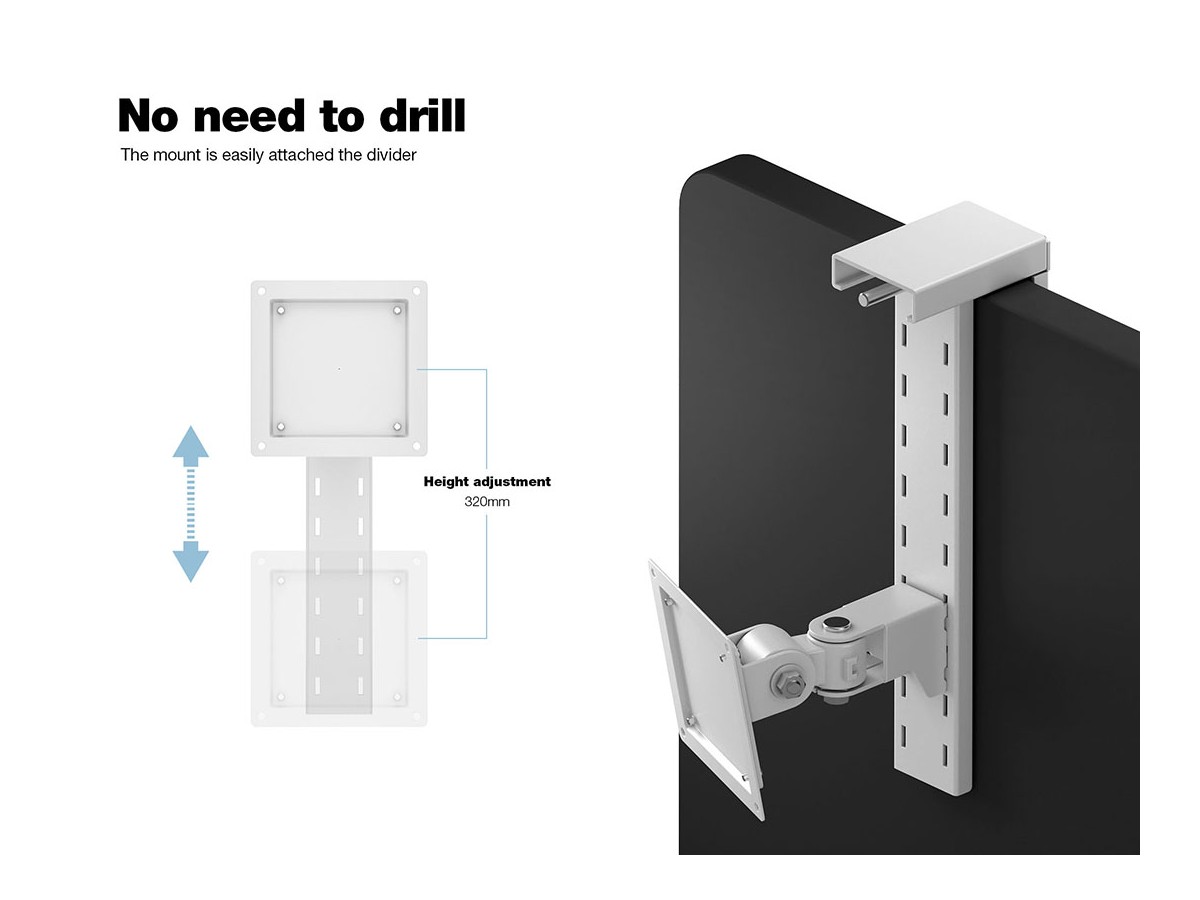 Setup is amazingly easy. It is suitable for partition panels with a typical thickness of 30mm to 80mm, and is optimized for panels with a height adjustment of 320mm. Multibrackets offers a 5-year limited warranty.
