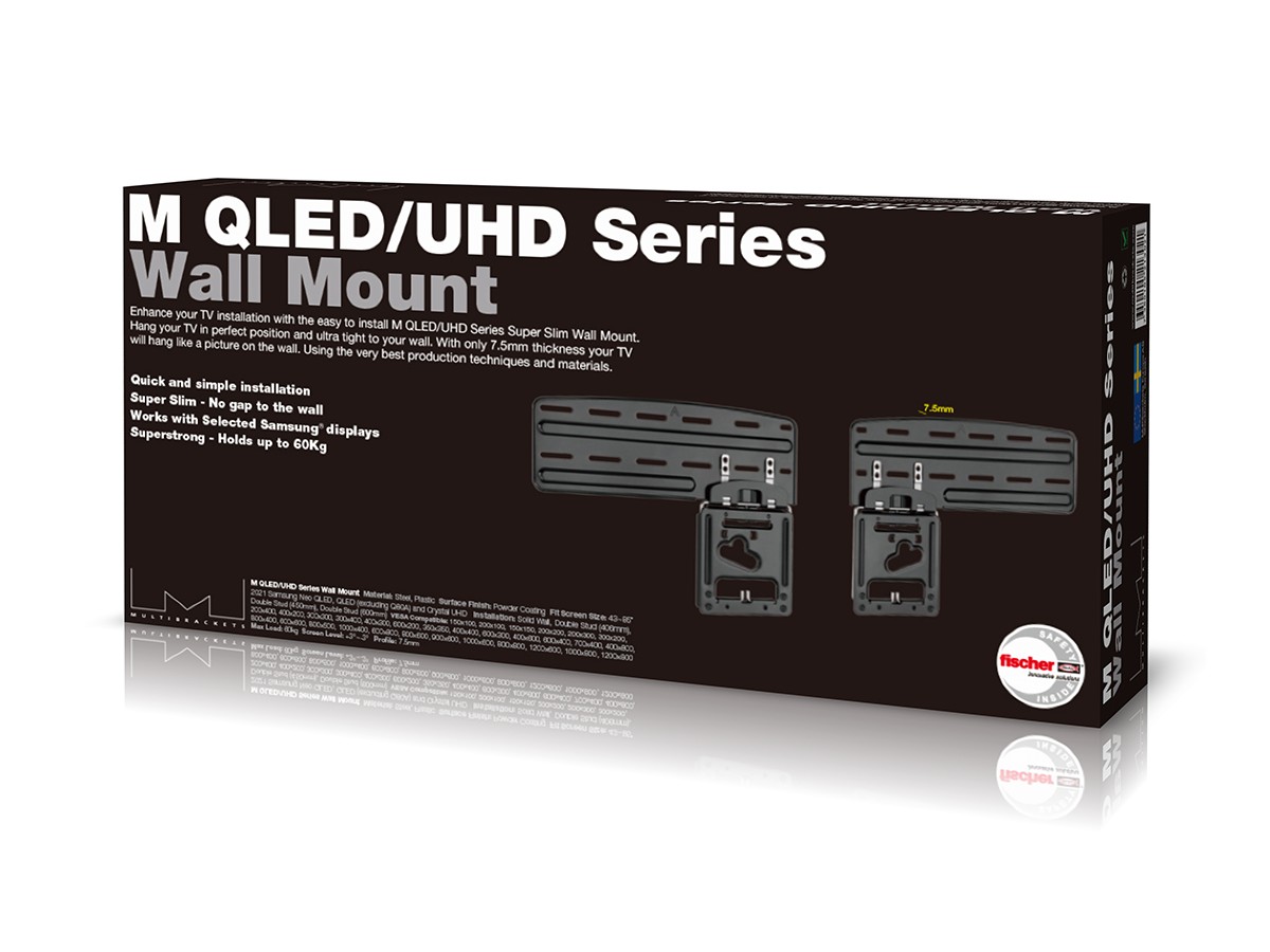 The all new M QLED/UHD Series Wall Mount Slim Fit is designed to perfectly fit the the new ultra thin QLED and UHD TV´s by Samsung*. Enhance your QLED installation with the easy to install M QLED/UHD Series Wall Mount Slim Fit. Adjust and correctly set your TV position with the wall mount kit and hang your TV very snug to wall.
