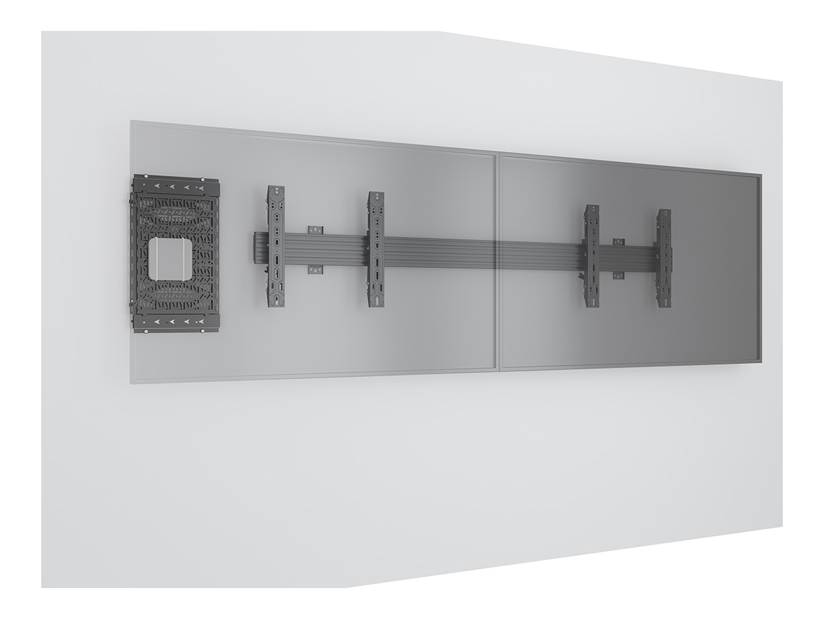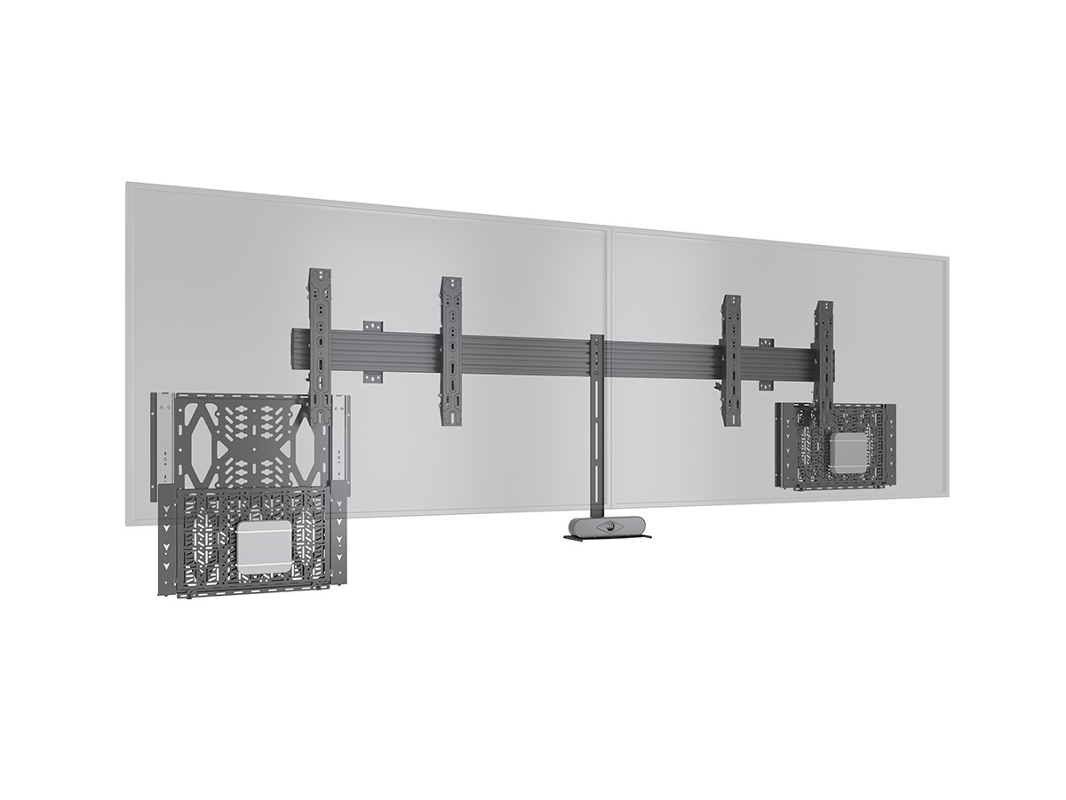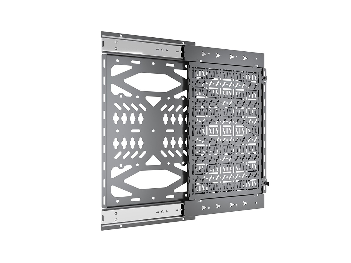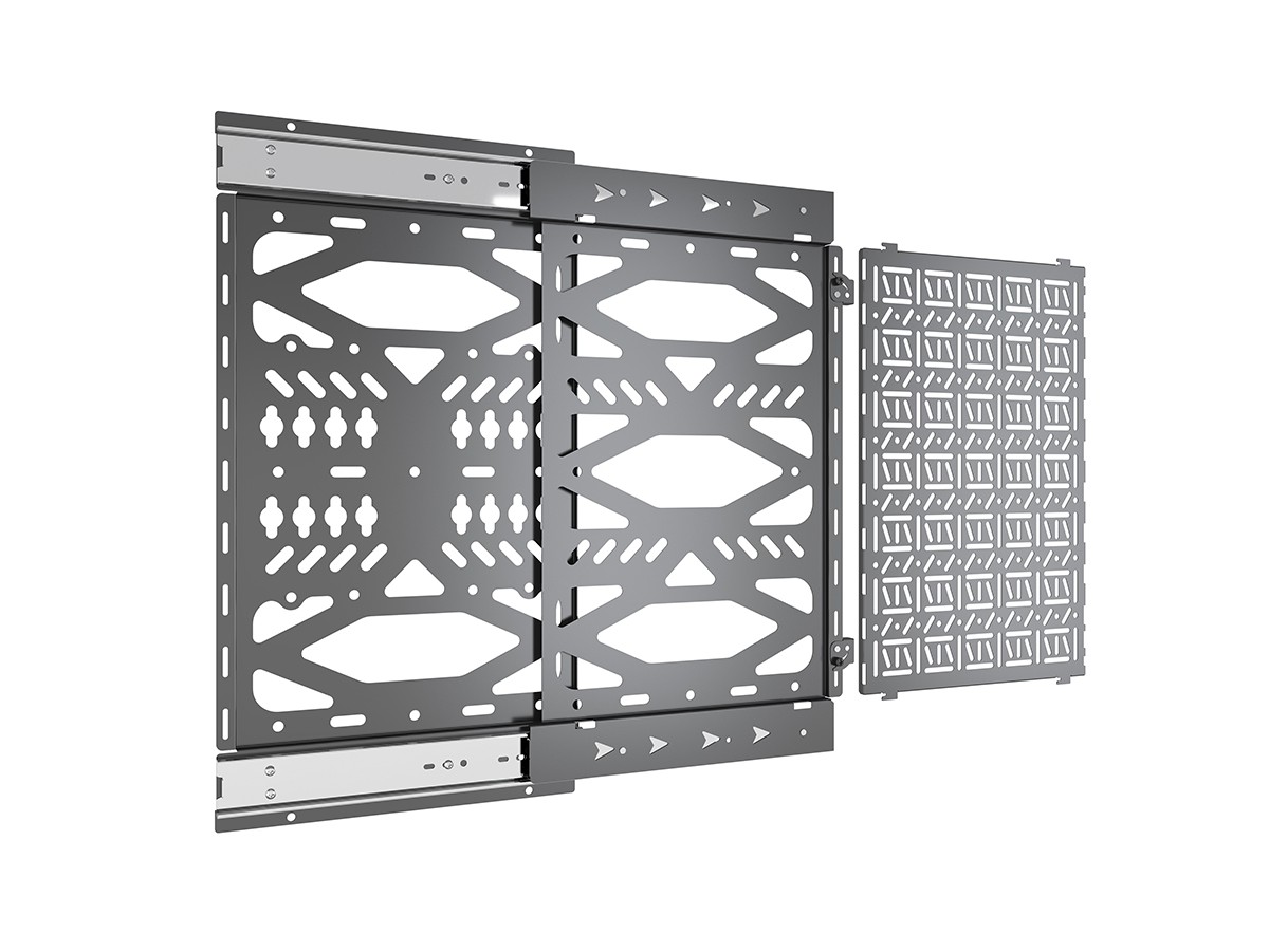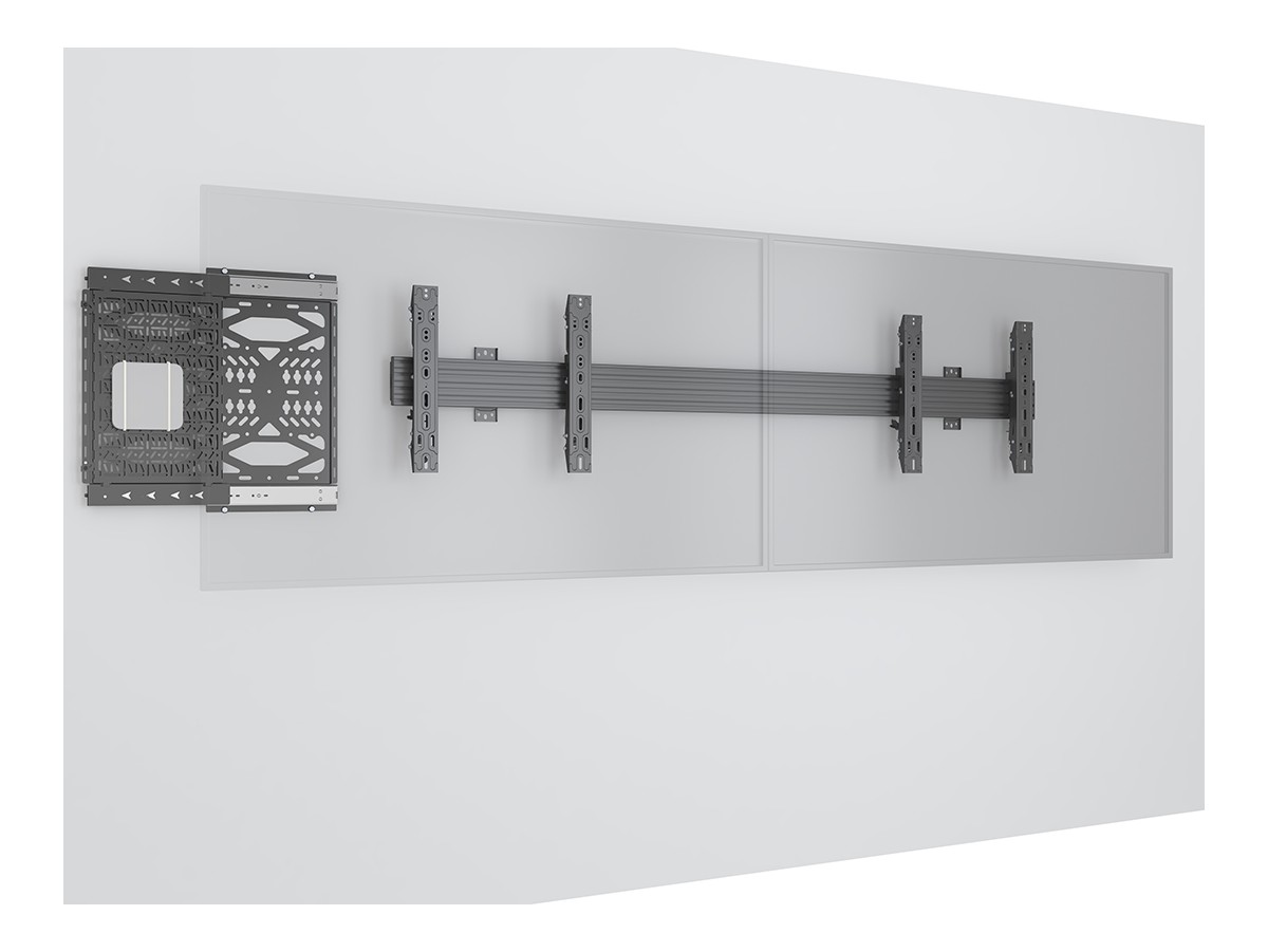 Multibrackets Pro Series solution for integrating a storage tray behind the display. Our M Pro Series Media Storage panel is a component storage slide out panel that facilitates easy access and concealed mounting of AV equipment behind displays. Now AV equipment can be accessed withoth the need to remove the display.