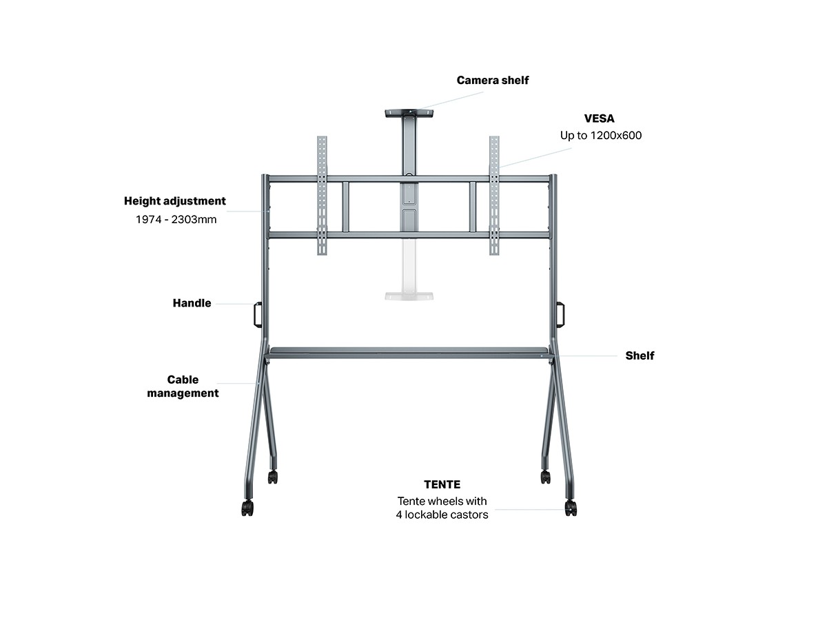 Easy screen height- adjustment, and mobility mean that an optimal viewing position can always be achieved for any presentation, digital -signage or video-conference situation. The heavy -duty TENTE castors feature a safety- brake, ensuring the stand cannot roll out of position, whilst the Integrated cable- management system ensures a tidy and professional look.