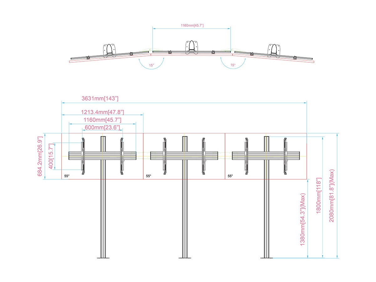 Product code:M Pro Series – Video Wall Floormount MBFMC3x1U - Floor column mount for triple displays, steel, 3 screens, single side, micro adjustable arms, VESA Max 600x400 - black