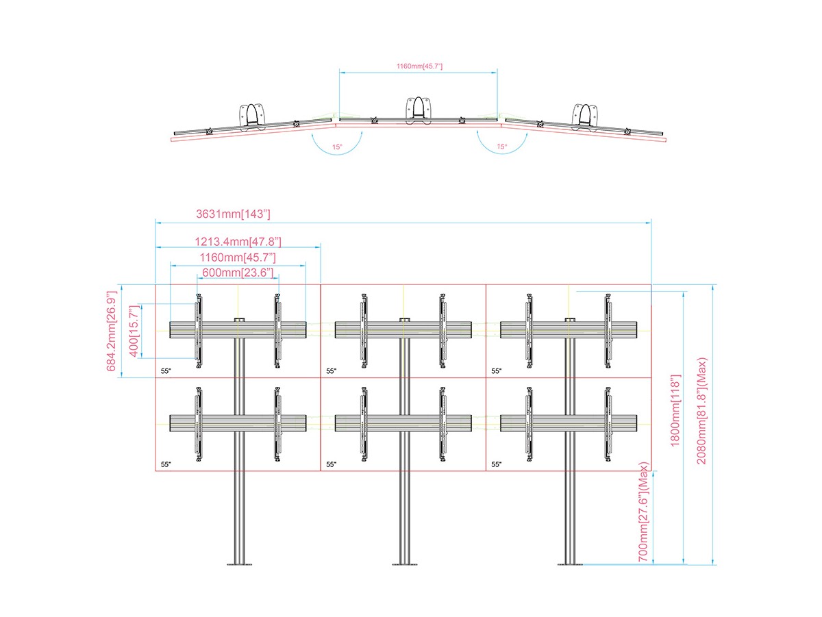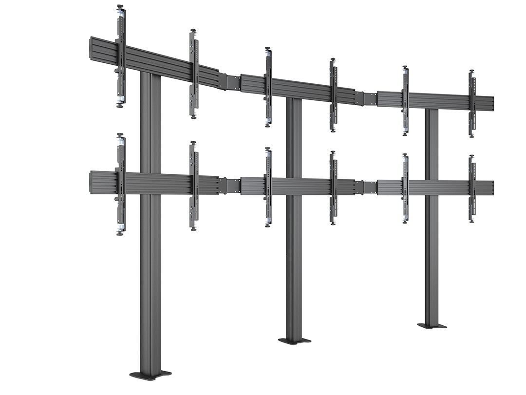 Product code:M Pro Series – Video Wall Floormount MBFMC3x2U - Floor column mount for triple displays, steel, 6 screens, single side, micro adjustable arms, VESA Max 600x400 - black
