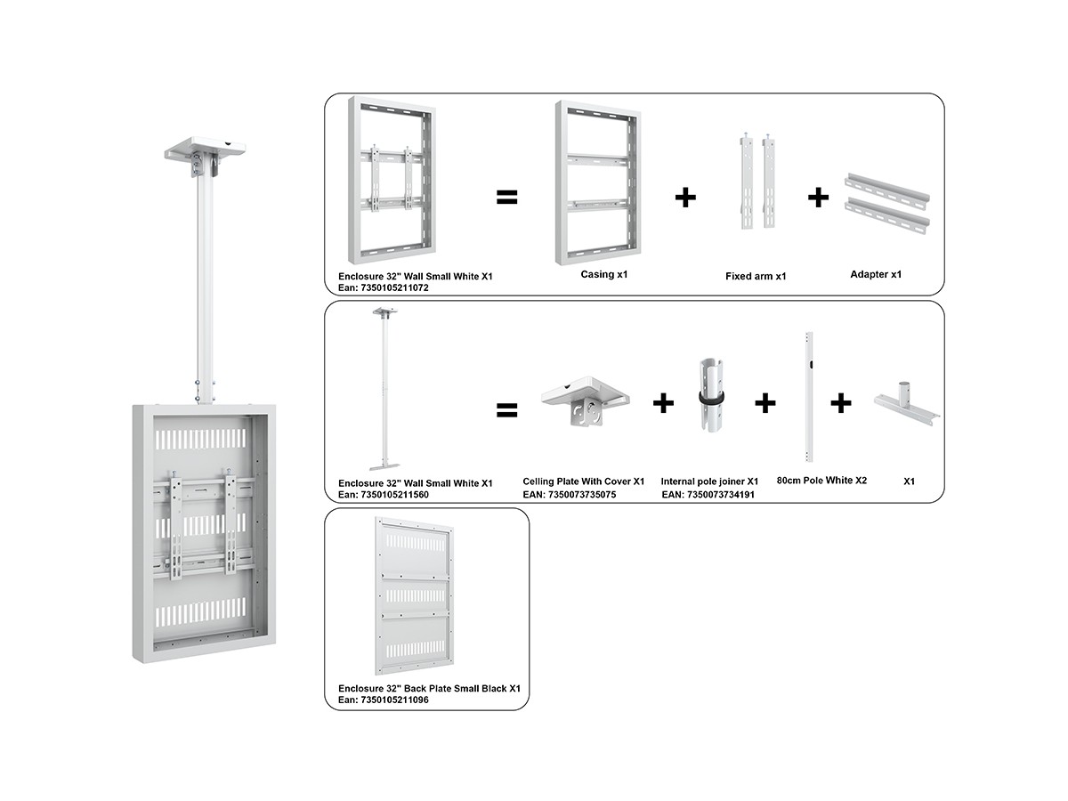 This Universal 32" Casing/ Enclosure was designed to blend in perfectly in most environments. Added its ingenious design makes many smart options available right away or after time, mounting solutions with wire function, floor to ceiling or floor stand and ceiling mounting is available.