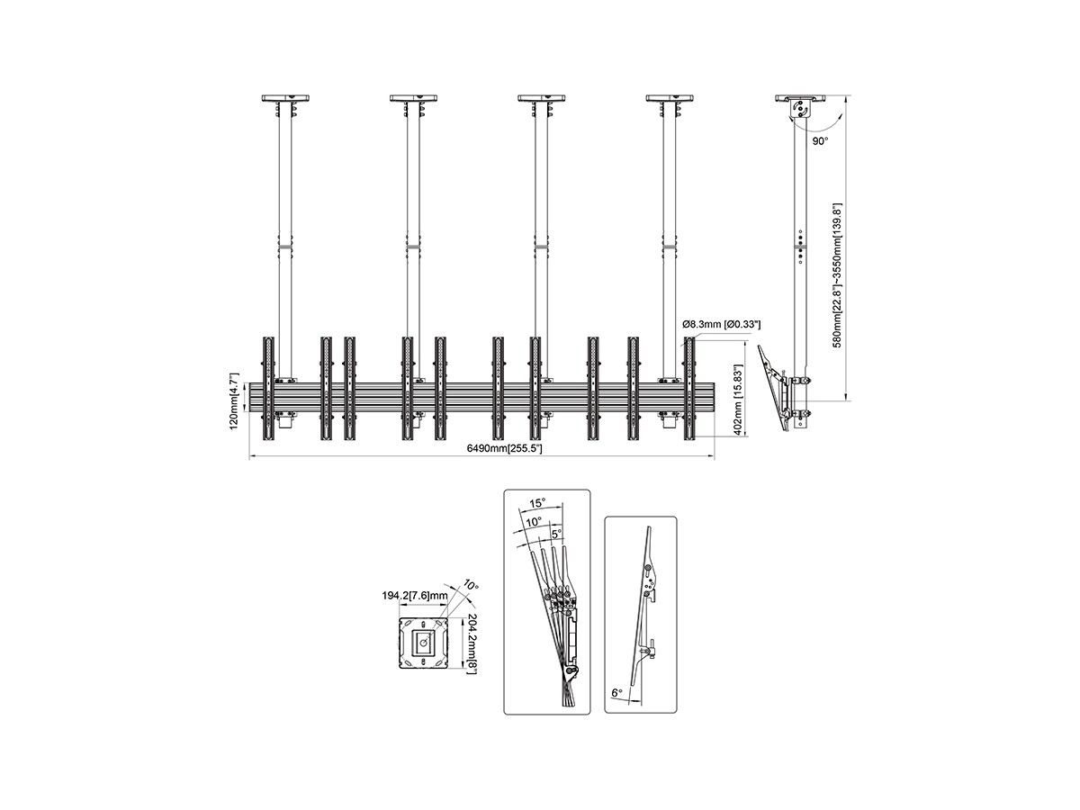 | Pillar length: | Min: 580mm to Max: 3550 mm from ceiling to VESA plate center Extension pipes: 3m (800mm*12pcs) included |