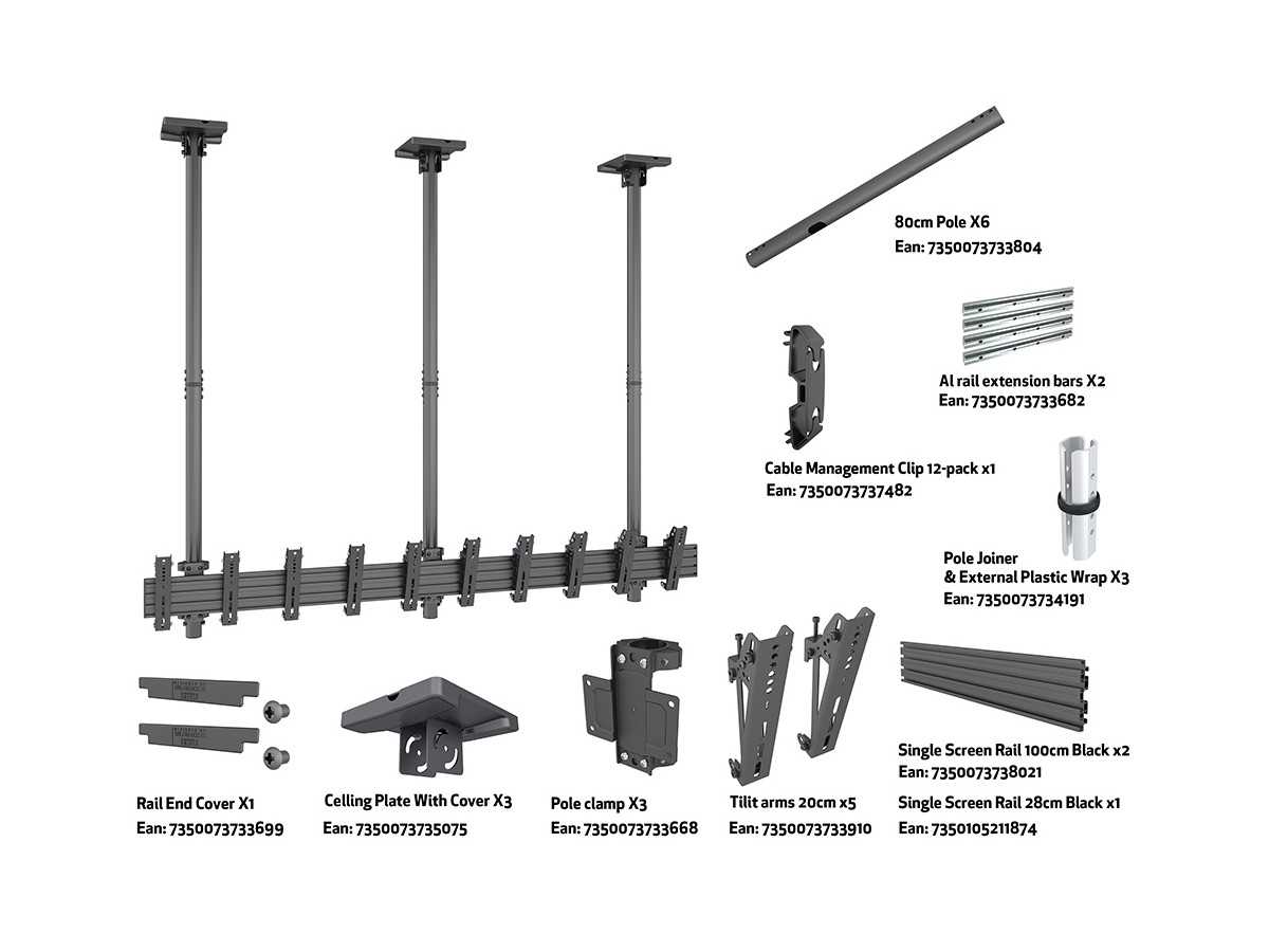 Product code:M Ceilingmount Pro MBC5X1UP VESA 200 - Ceiling mount for LCD display, steel, 3m length, 5 screens, single sided portrait position, tilt arms, VESA Max 200x200 - screen size: 27"-32" - black