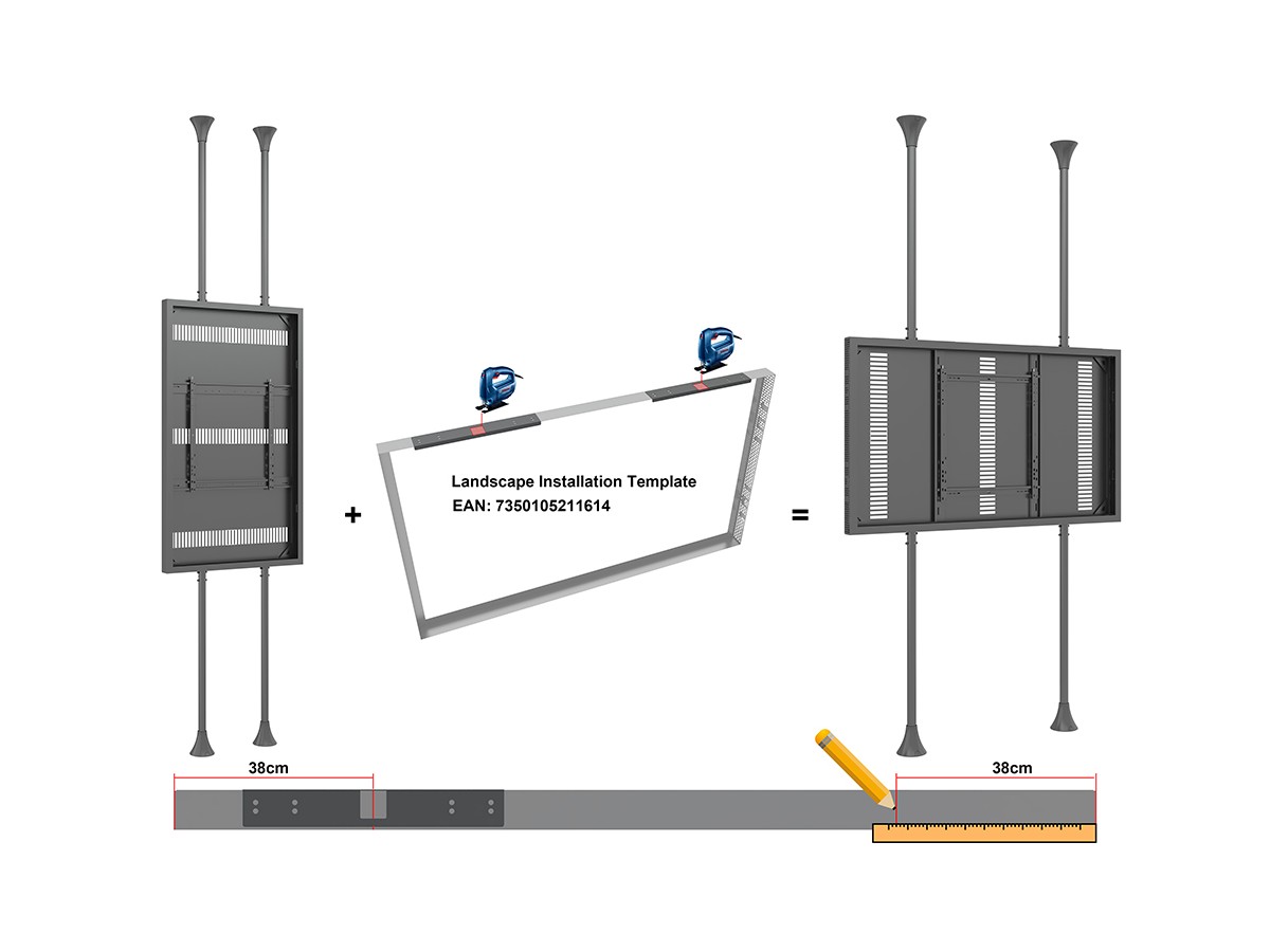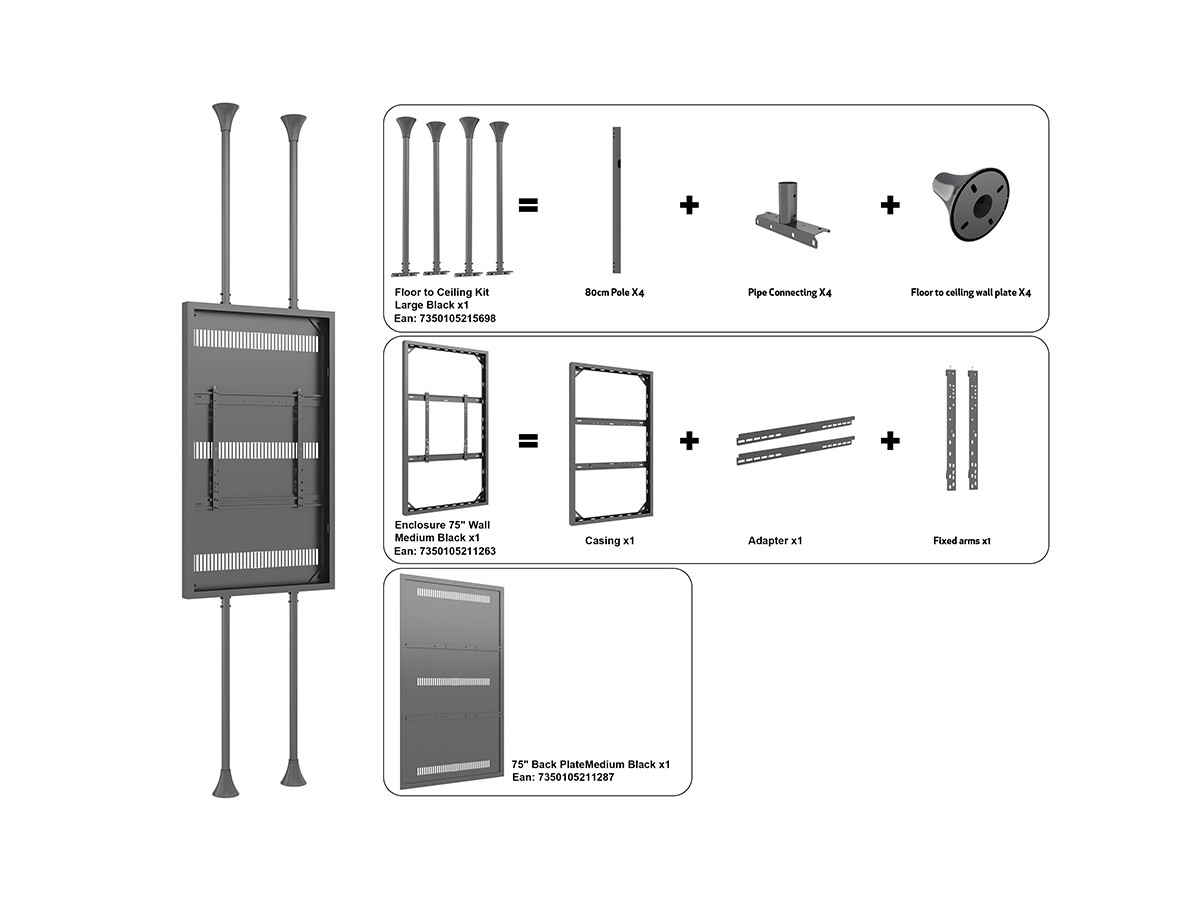 Product code:M Pro Series Enclosure 75" Floor to Ceiling Large Black – Floor to ceiling mount with casing for display, steel, 3m length, 1 screen, single side, fixed arms, VESA max 600x400 - screen size: 75" - black