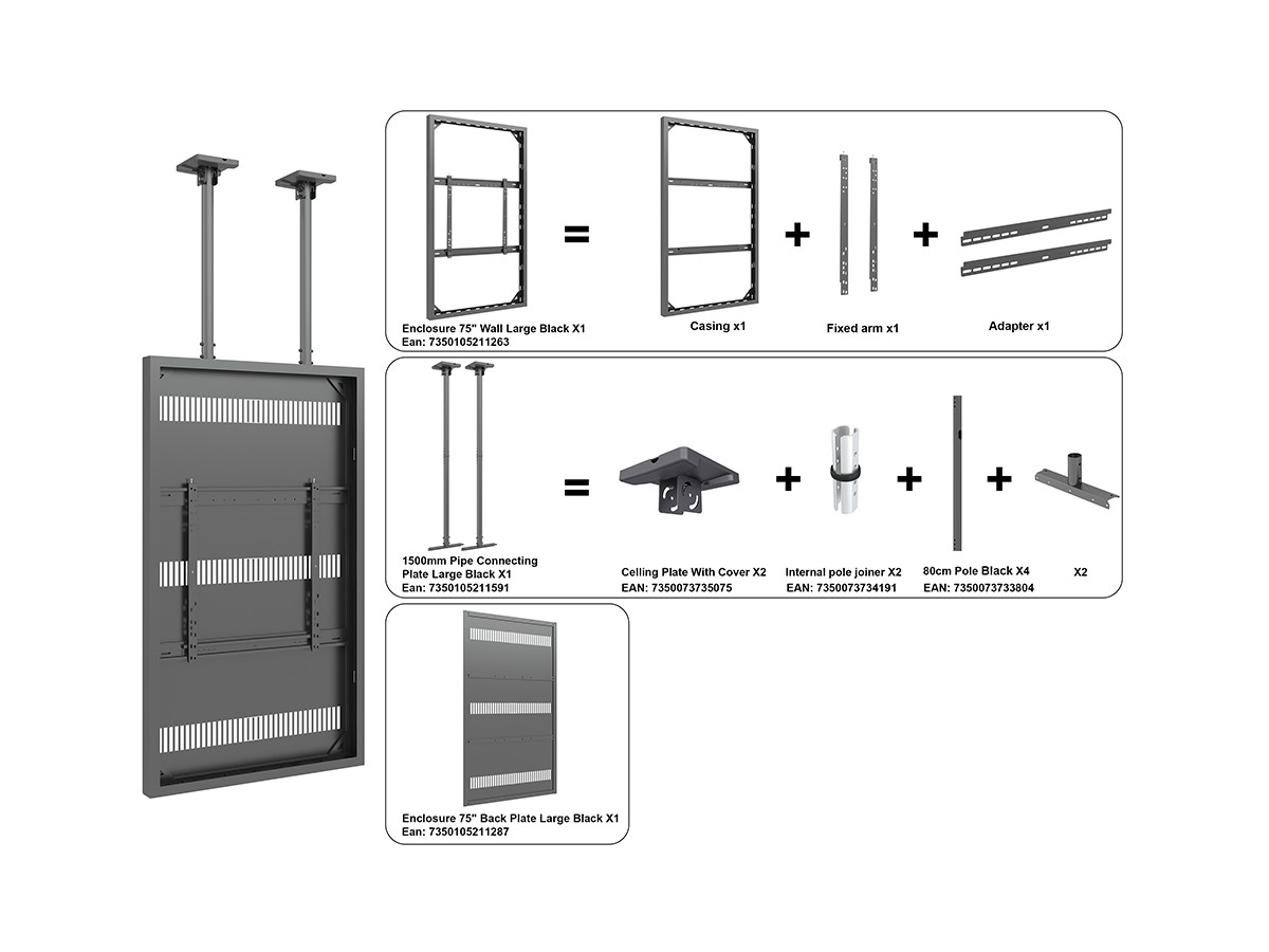 This Universal 75" Casing/ Enclosure was designed to blend in perfectly in most environments. Added its ingenious design makes many smart options available right away or after time, mounting solutions with wire function, floor to ceiling or floor stand and ceiling mounting is available.