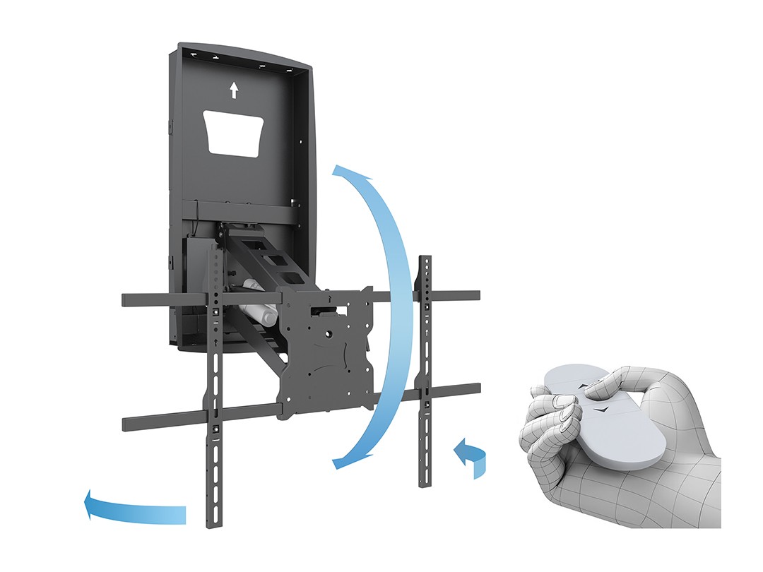 Do you want to position your TV high or low depending on situation. Get a always comfortable eye-level view. This motorized assisted mount lets you effortlessly pull the display forward and down to a comfortable viewing position, where you can turn it left or right for any angle. When not used the display can be moved up the mount returns the display to its its original position flat above.