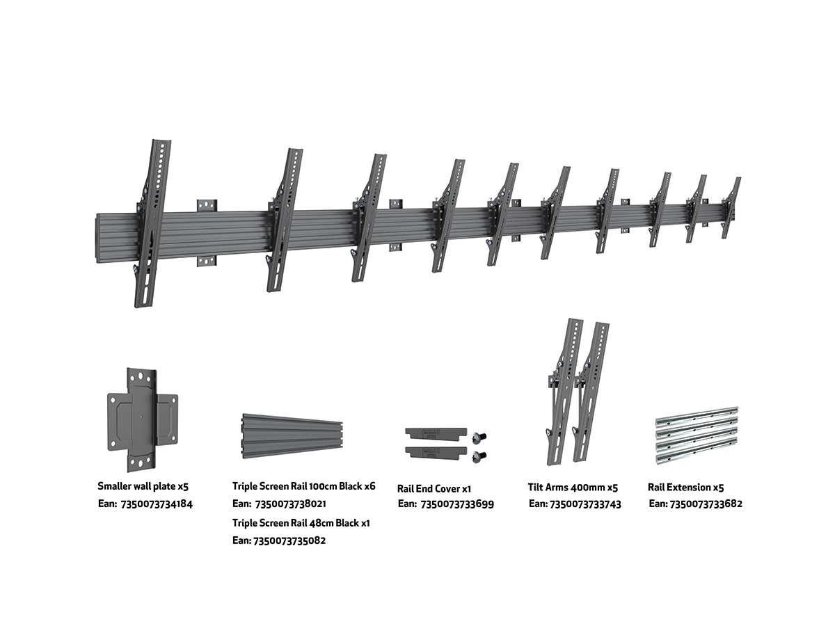 Product code:M Wallmount Pro MBW5U Tilt Black - Wall mount for LCD display, steel, 5 screen, single side, tilt, VESA Max 400x400 - Maxload 30kg - screen size: 40"-65" - black