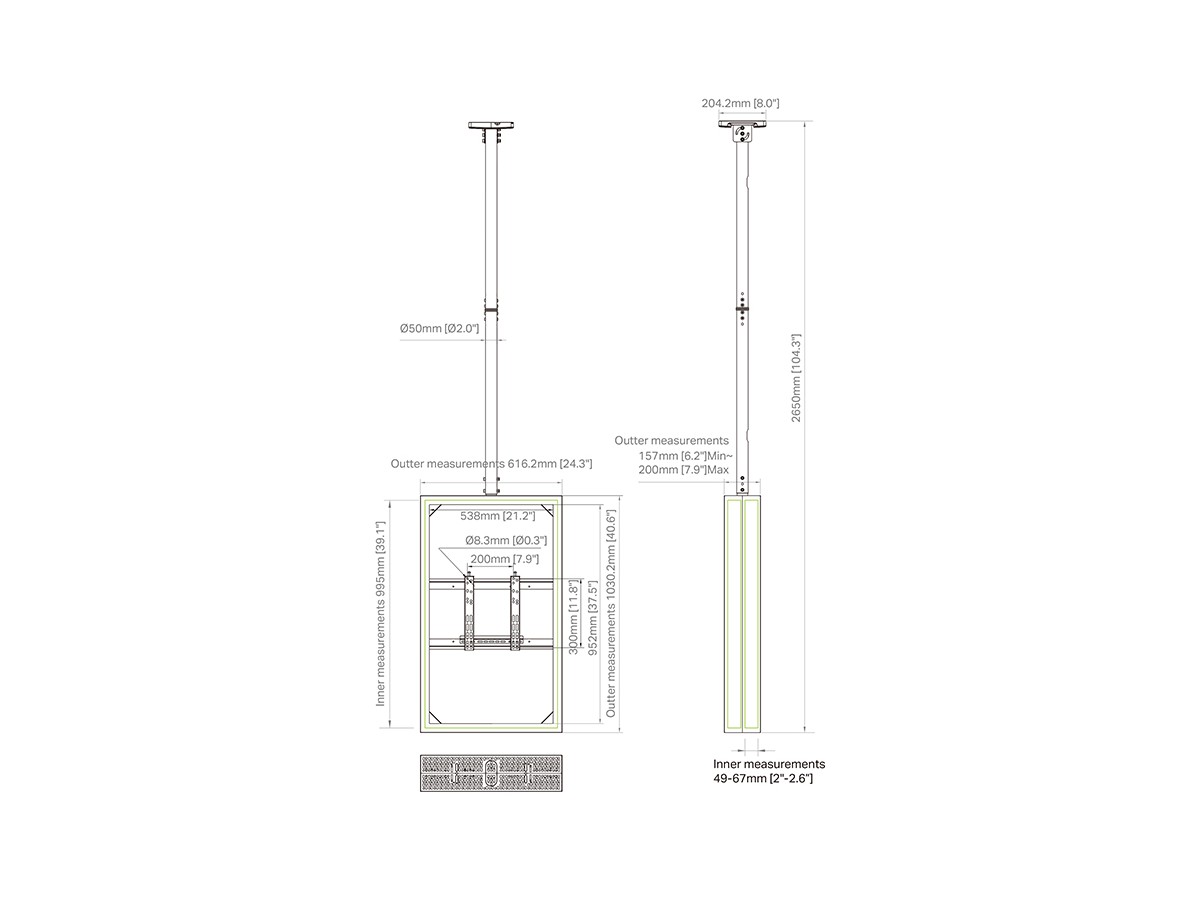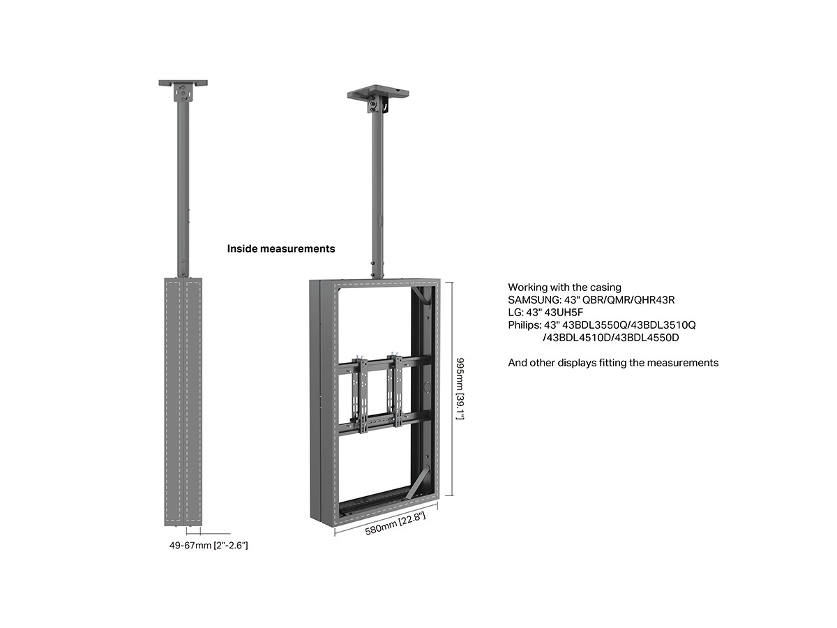 This Universal 43" Casing/ Enclosure was designed to blend in perfectly in most environments. Added its ingenious design makes many smart options available right away or after time, mounting solutions with wire function, floor to ceiling or floor stand and ceiling mounting is available.