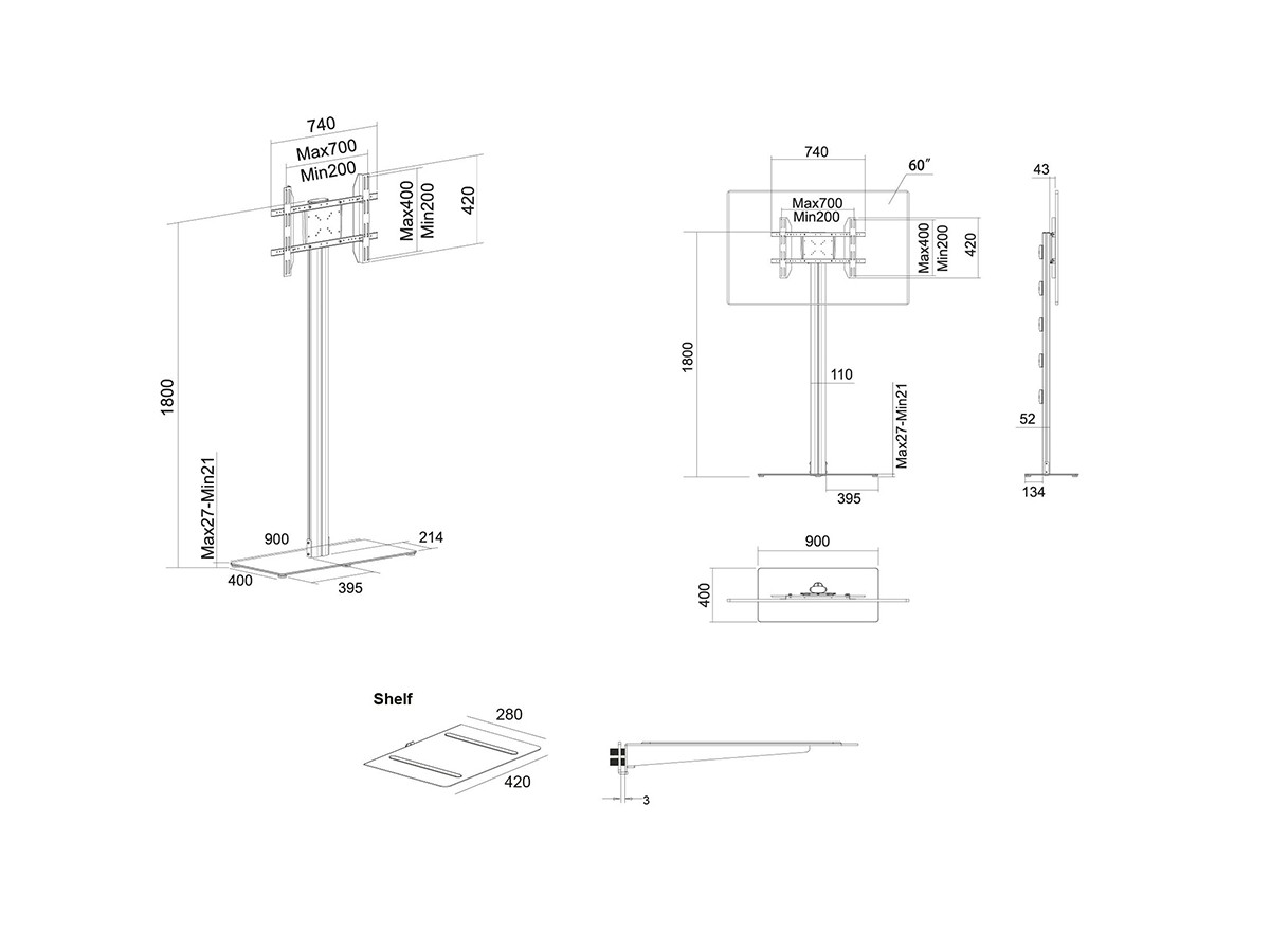 Product code:M Display Stand 180 Single Black w Floorbase/Shelf - Stand for LCD / LED panel - aluminum, steel - black - screen size: 24" - 65" - VESA: 75x75 to 700x400 mm - floor-standing