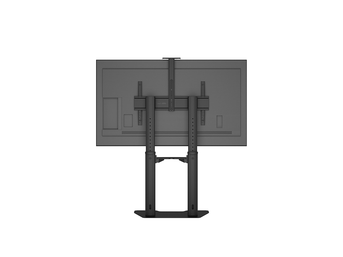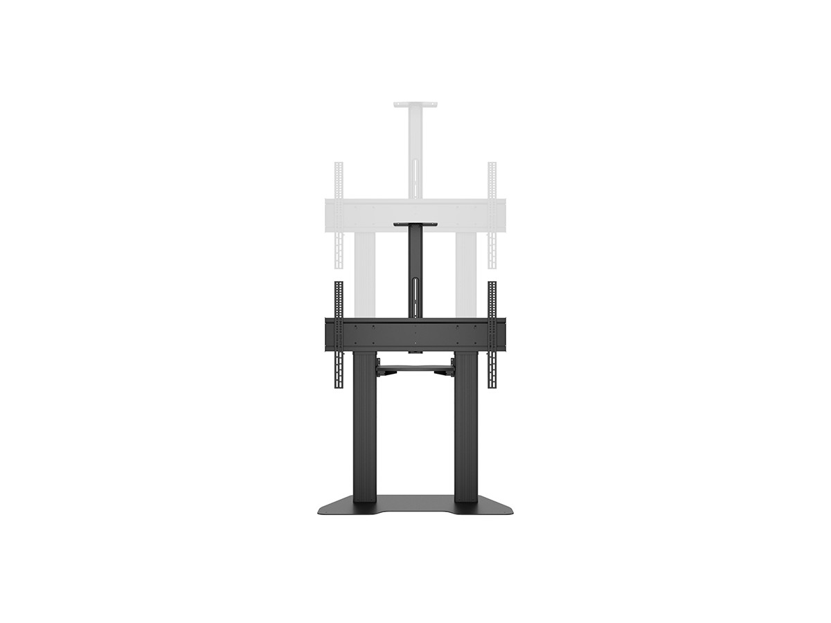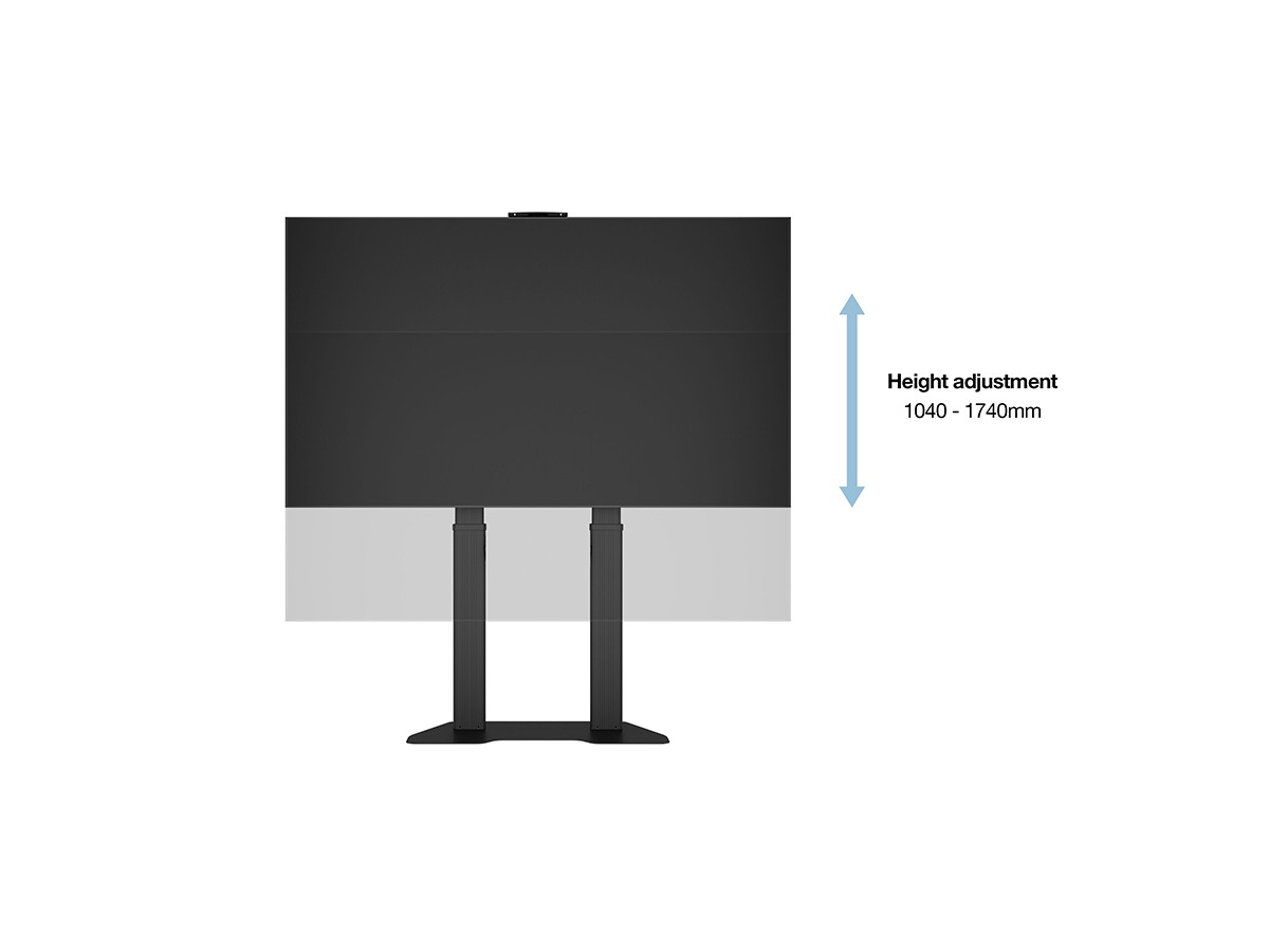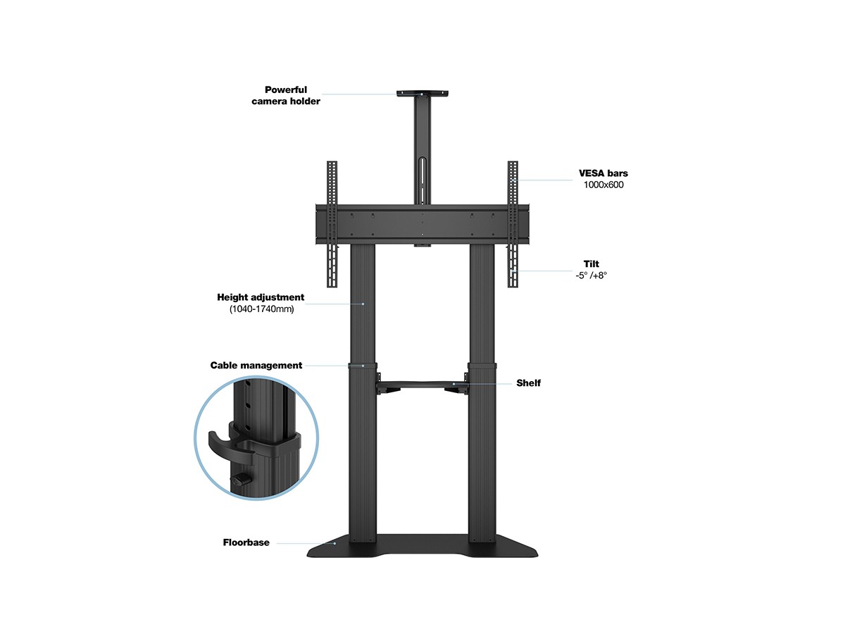 Now you can mount flat panel screens up to 100" displays on a movable Floorstand. With its black, textured powder coat finish it helps hide finger prints or dust. This Floorstand features an easy to position display height adjustment function that is unique. This innovative design with a built in stopper mechanism into the two columns creates a tool free and effortless TV height adjustment. This function reduces time consuming adjustments of height that is used on other floorstands. Now you in seconds can match your audience wheter its sitting or standing up. For fast installation the base comes pre-assembled. VESA specifications ranges from 200x200 up to 1000x600 VESA display mounting pattern, and sturdy swivel casters – two of which are lockable to keep the Floorstand in it´s place. The integrated cable management system that helps keep your cables organized and out of the way. During its introduction this versatile Floorstand also comes with accessories such as the component shelf and camerashelf included as standard.