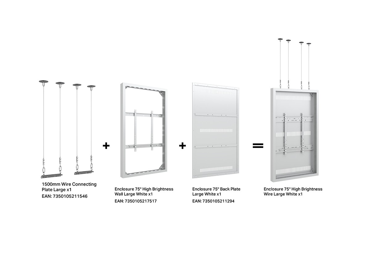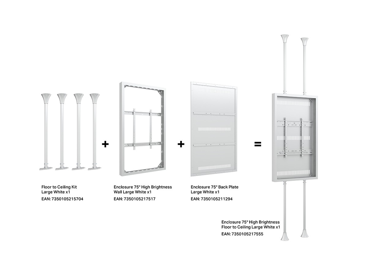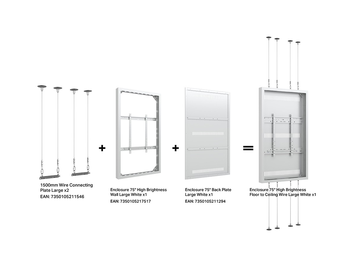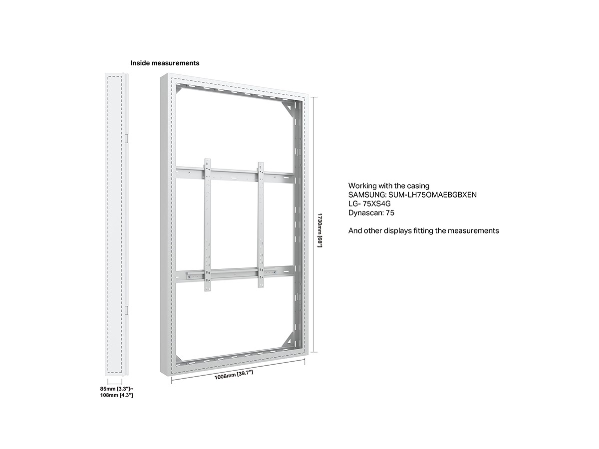 This Universal 75" High Brightness Casing/ Enclosure was designed to blend in perfectly in most environments. Added its ingenious design makes many smart options available right away or after time, mounting solutions with wire function, floor to ceiling or floor stand and ceiling mounting is available.