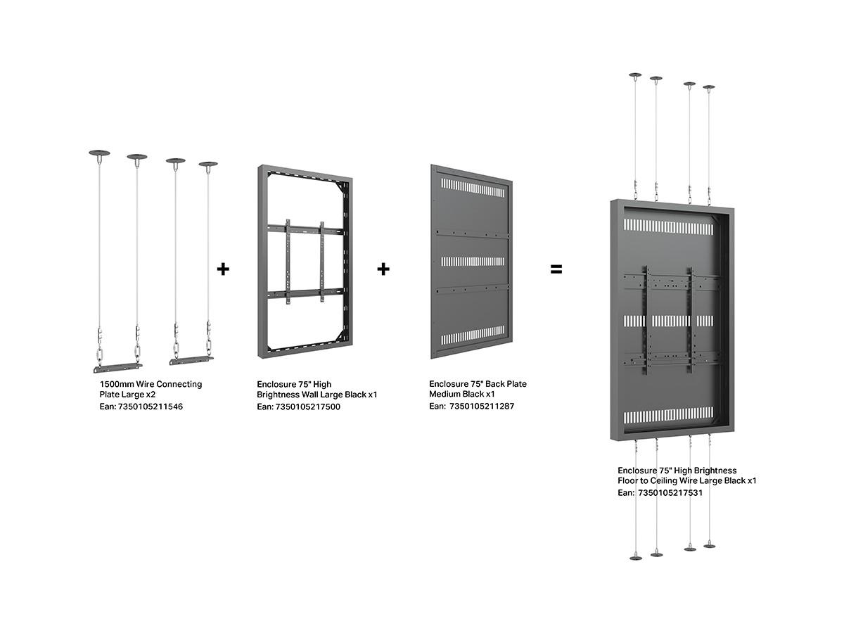 The M Pro Series Enclosure 75" High Brightness Wire Large Black. A well-designed casing /enclosure with hanging wires. Creating a minimalistic look and possible to mount in both Portrait or Landscape position this casing from Multibrackets® is one of the most versatile to date. The casing includes after adjustment possibilities and can be used for most brands of signage displays on the market. With a smart thermal management, this solution can fit more brands as well as creating thermal management second to none. Wire diameter 5mm.