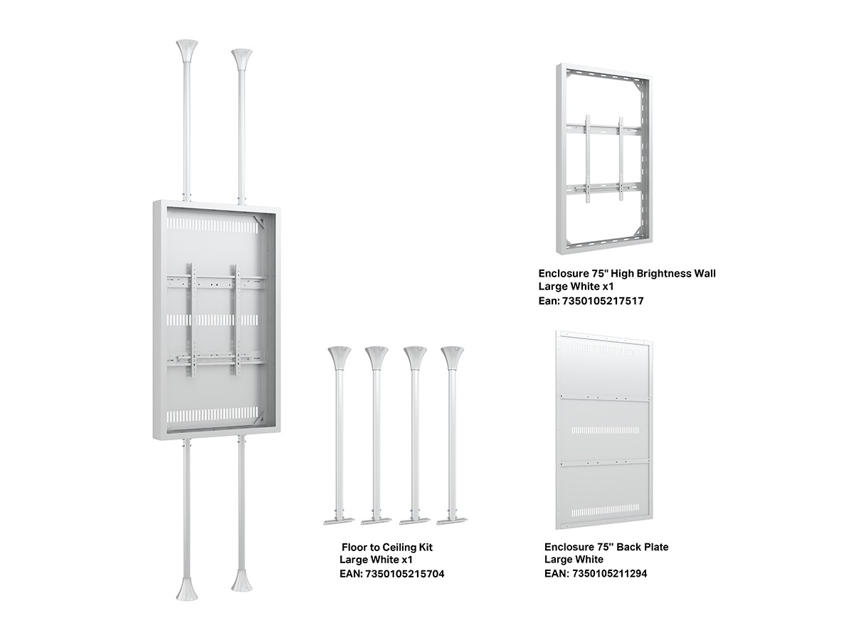 Product code:M Pro Series Enclosure 75" High Brightness Floor to Ceiling Large White - Floor to ceiling mount with casing for display, steel, 3m length, 1 screen, single side, fixed arms, VESA max 600x800 - screen size: 75" - white