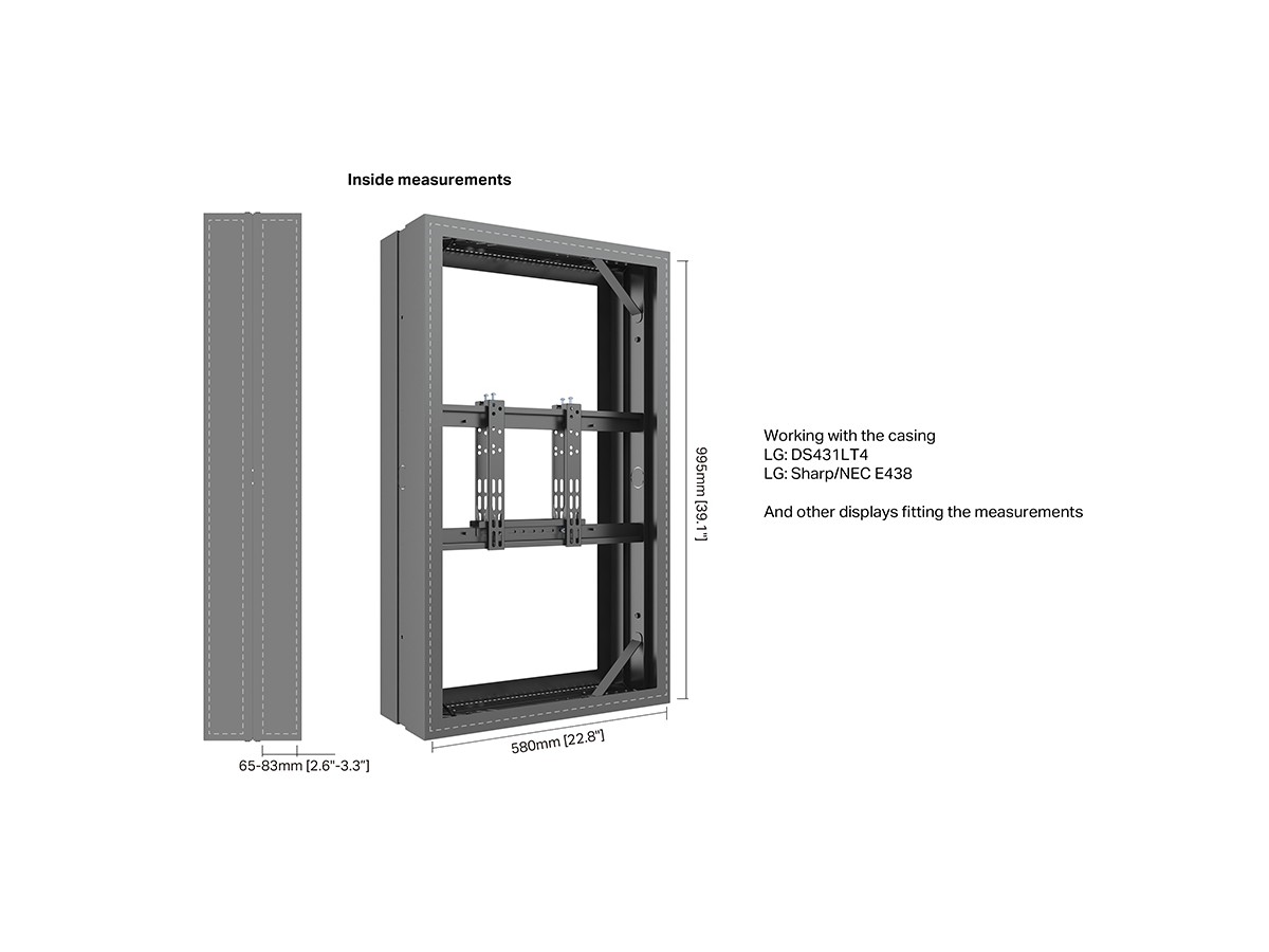Creating a minimalistic look and possible to mount in both Portrait position this 43” front frame from Multibrackets® is a well-ventilated and clean designed, adding versatile to the Multibrackets 43” casing. Used with the 43” enclosure and creating the extra space and ventilation that a high brightness display uses and needs for its depth inside the casing.