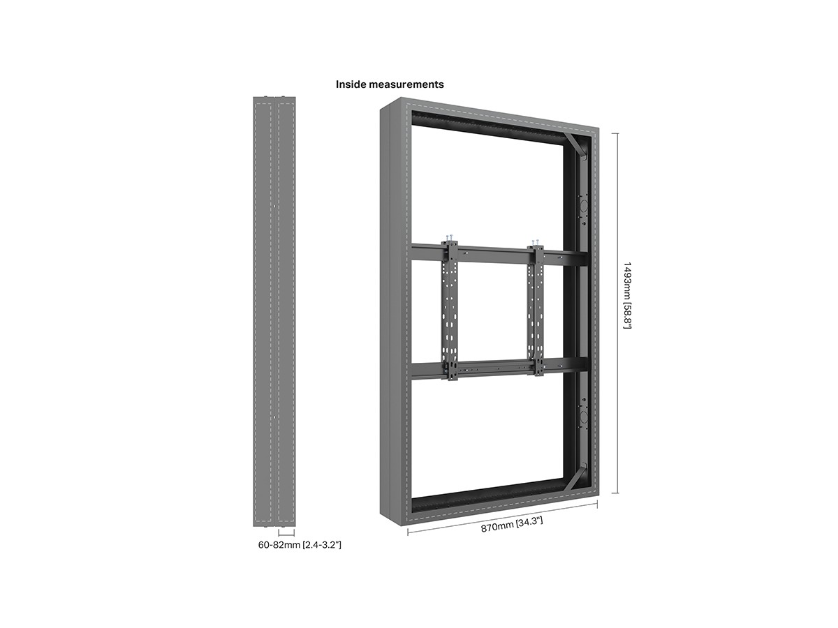Creating a minimalistic look and possible to mount in both Portrait position this 65” front frame from Multibrackets® is a well-ventilated and clean designed, adding versatile to the Multibrackets 65” casing. Used with the 65” enclosure and creating the extra space and ventilation that a high brightness display uses and needs for its depth inside the casing.